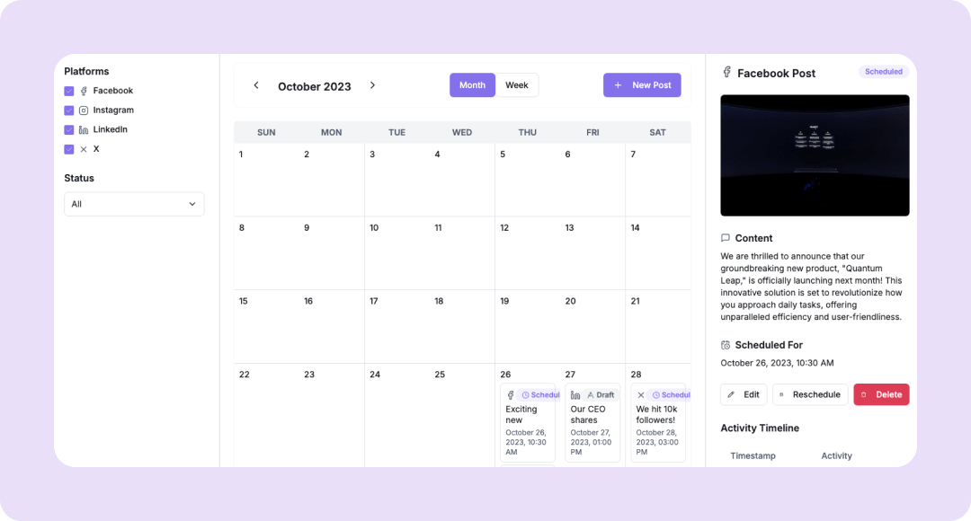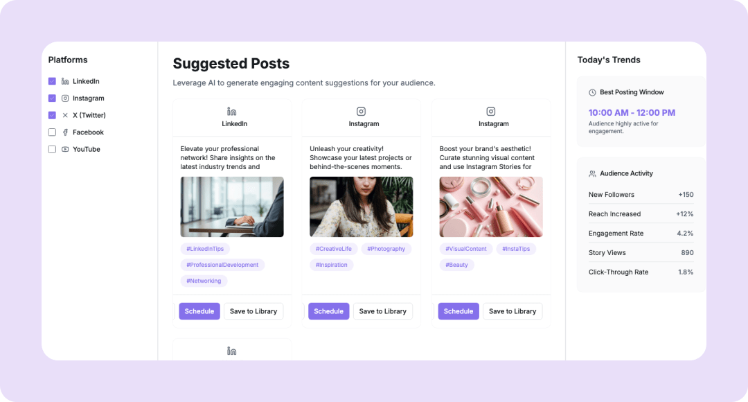 Simplify your social media management with AI-powered content suggestions, scheduling intelligence, and cross-platform publishing — all from a single dashboard.