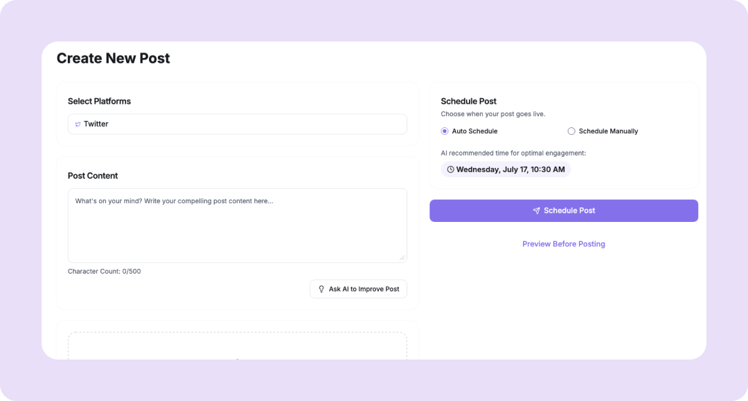 - Optimal Time Detection: Learns audience behavior for best posting slots