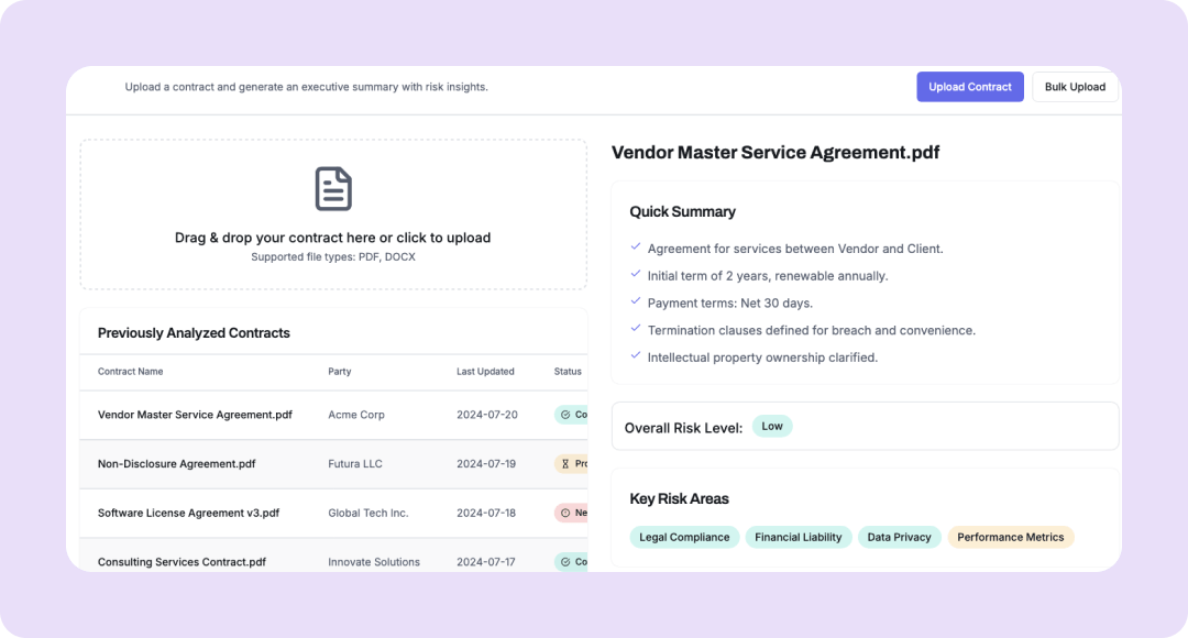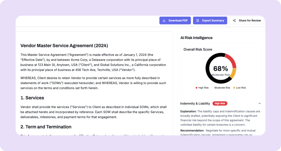 The Contract Summarizer (GPT) is an AI-powered legal intelligence module that reads and interprets lengthy legal documents. It extracts critical clauses such as indemnities, liabilities, confidentiality, and renewal terms and provides a structured summary with AI-generated risk tags. With built-in OCR, it can process both digital and scanned PDFs, providing instant summaries for lawyers, compliance officers, and procurement teams.