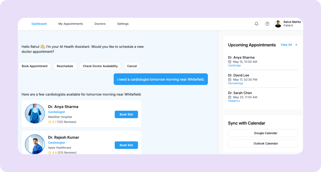The Doctor Appointment Chatbot is a conversational AI solution that allows patients to interactively search for doctors by name, specialty, or location and book appointments in real time. It manages appointment slots dynamically, integrates with doctor calendars, and can handle rescheduling or cancellations automatically.