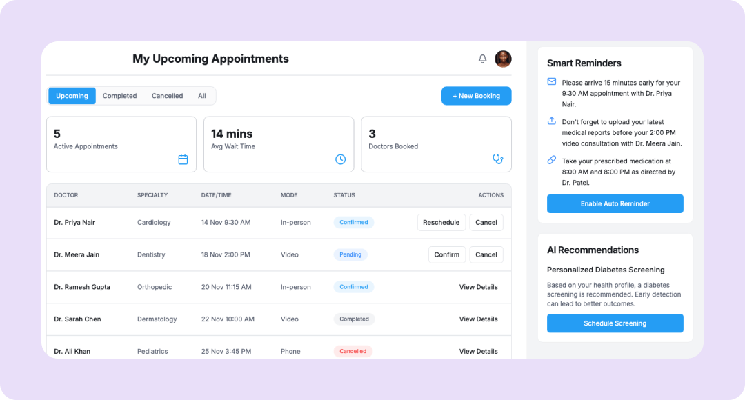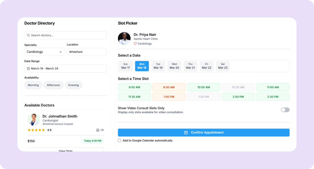 • EHR/Calendar Systems: Practo, HealthPlix, Zoho Bookings, Google Calendar
