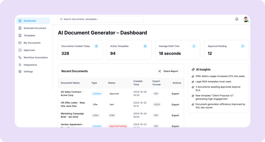 Generate contracts, letters, offers, and reports in seconds using Kriatix’s Document Generator—powered by templates and AI-assisted prompts.