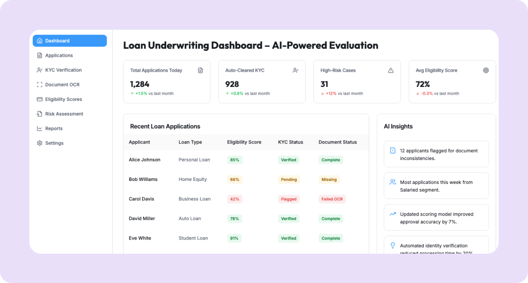 The Loan Eligibility & Underwriting Assistant automates the credit evaluation process by reading financial documents, analyzing applicant risk, and assigning eligibility scores. It combines OCR for document extraction, AI for scoring, and rule-based workflows for decision logic—reducing underwriting time from days to minutes. It’s built for banks, NBFCs, and lending fintech platforms seeking speed, accuracy, and compliance.