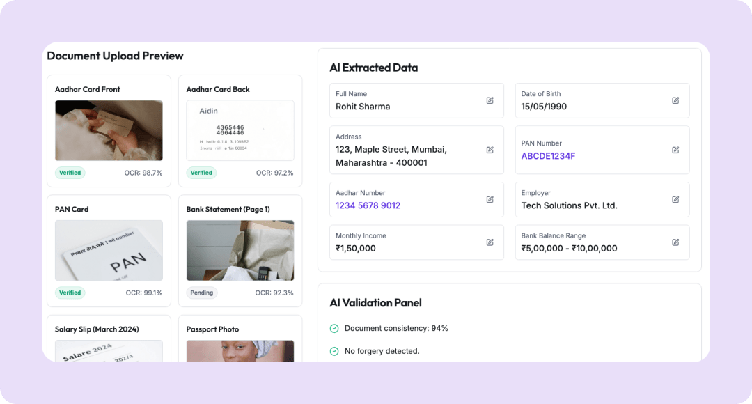- Document Extraction Engine: Uses OCR to read pay slips, bank statements, and IDs.