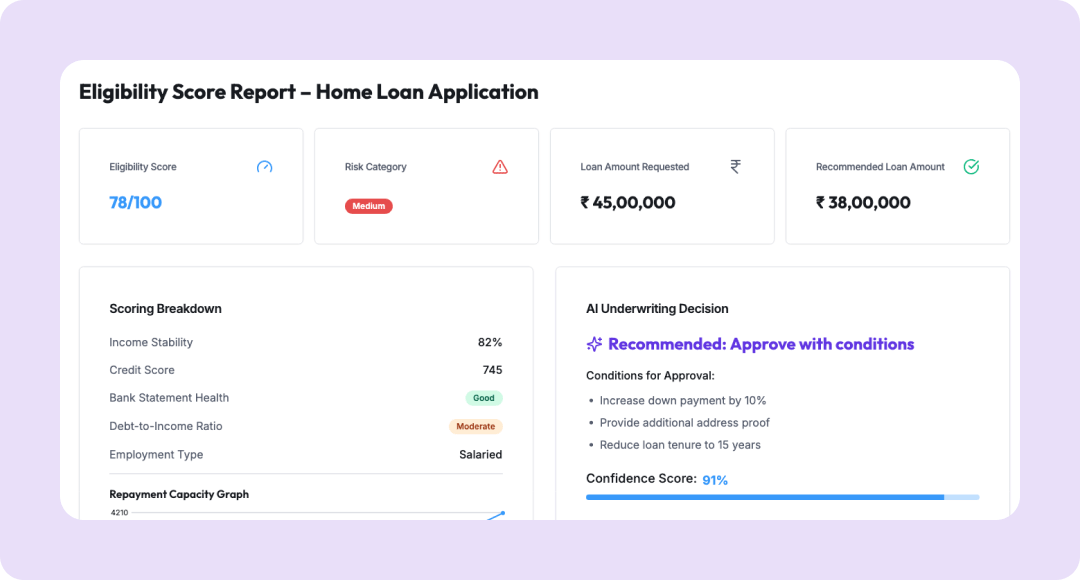 The Underwriting Assistant acts as a digital analyst that evaluates multiple data points: income proof, credit history, transaction behavior, and KYC documents.It validates uploaded data, assigns an eligibility score, and generates a recommendation (“Approve”, “Review”, or “Reject”).This workflow ensures consistent decision-making while reducing dependency on manual judgment.