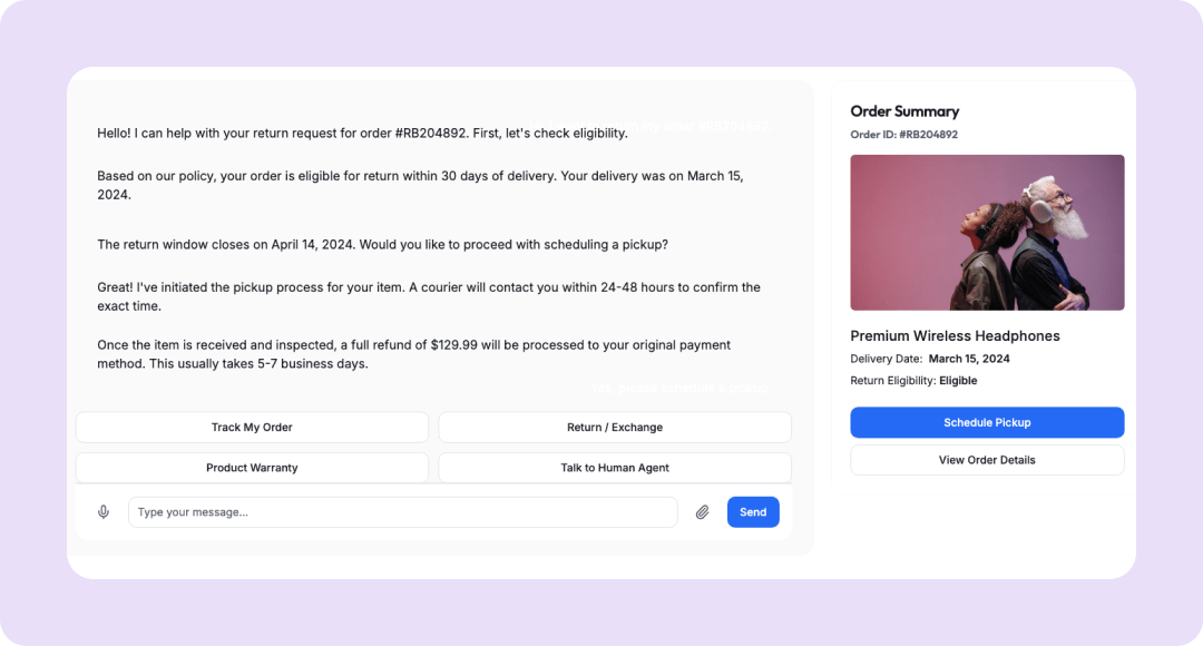 - Order Lookup API: Tracks deliveries, refunds, and replacements.