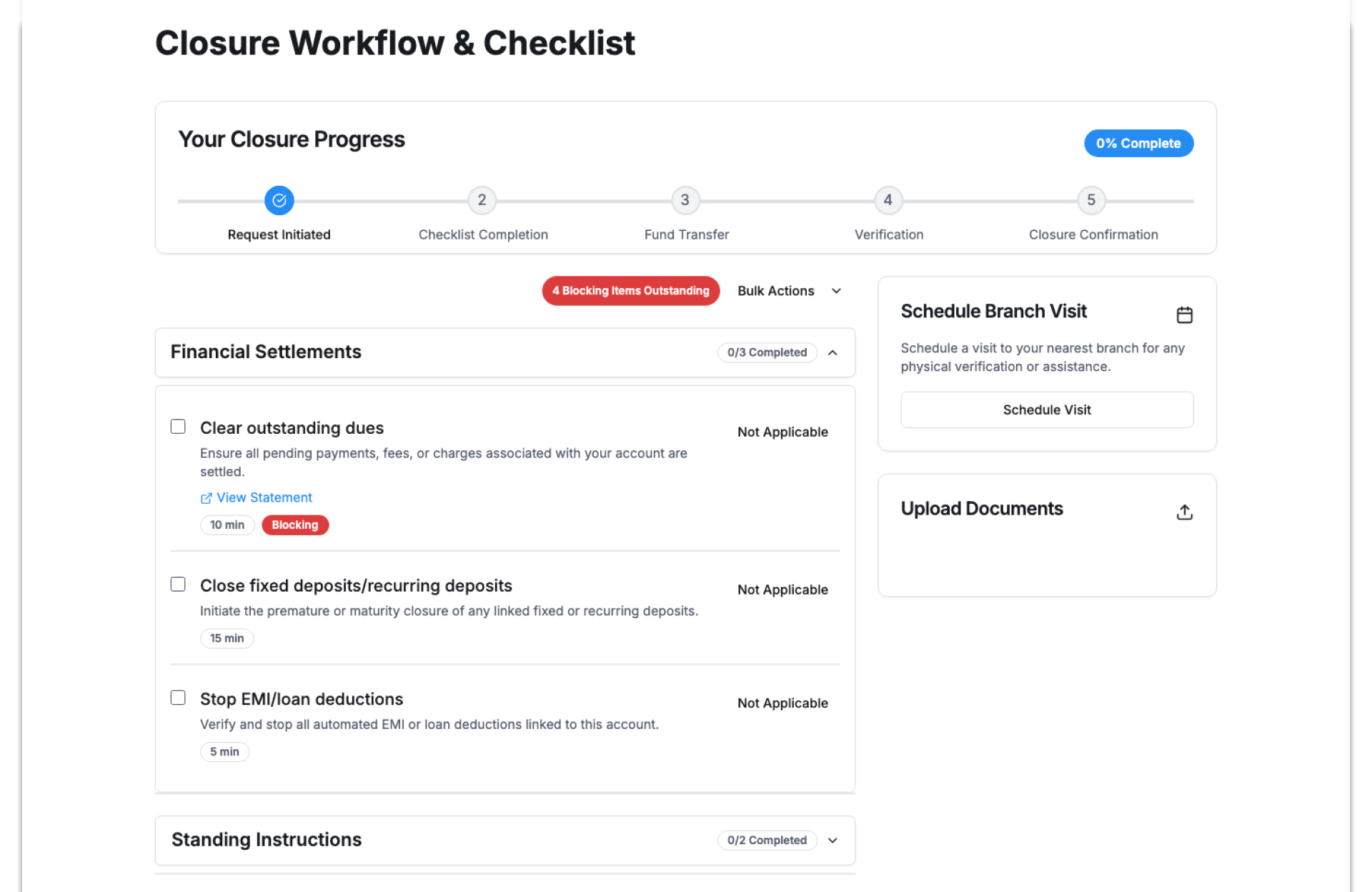 - Guided account closure request flow
