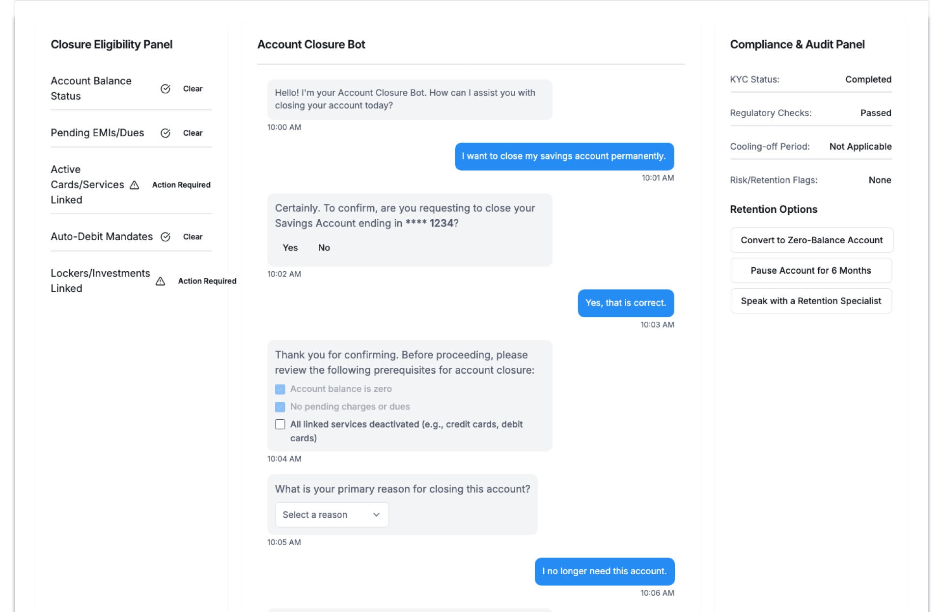 The Account Closure Request Bot by Kriatix simplifies how businesses manage account closure requests. It guides users through the process, captures required confirmations, and routes requests for review—reducing manual effort while ensuring compliance and clarity.