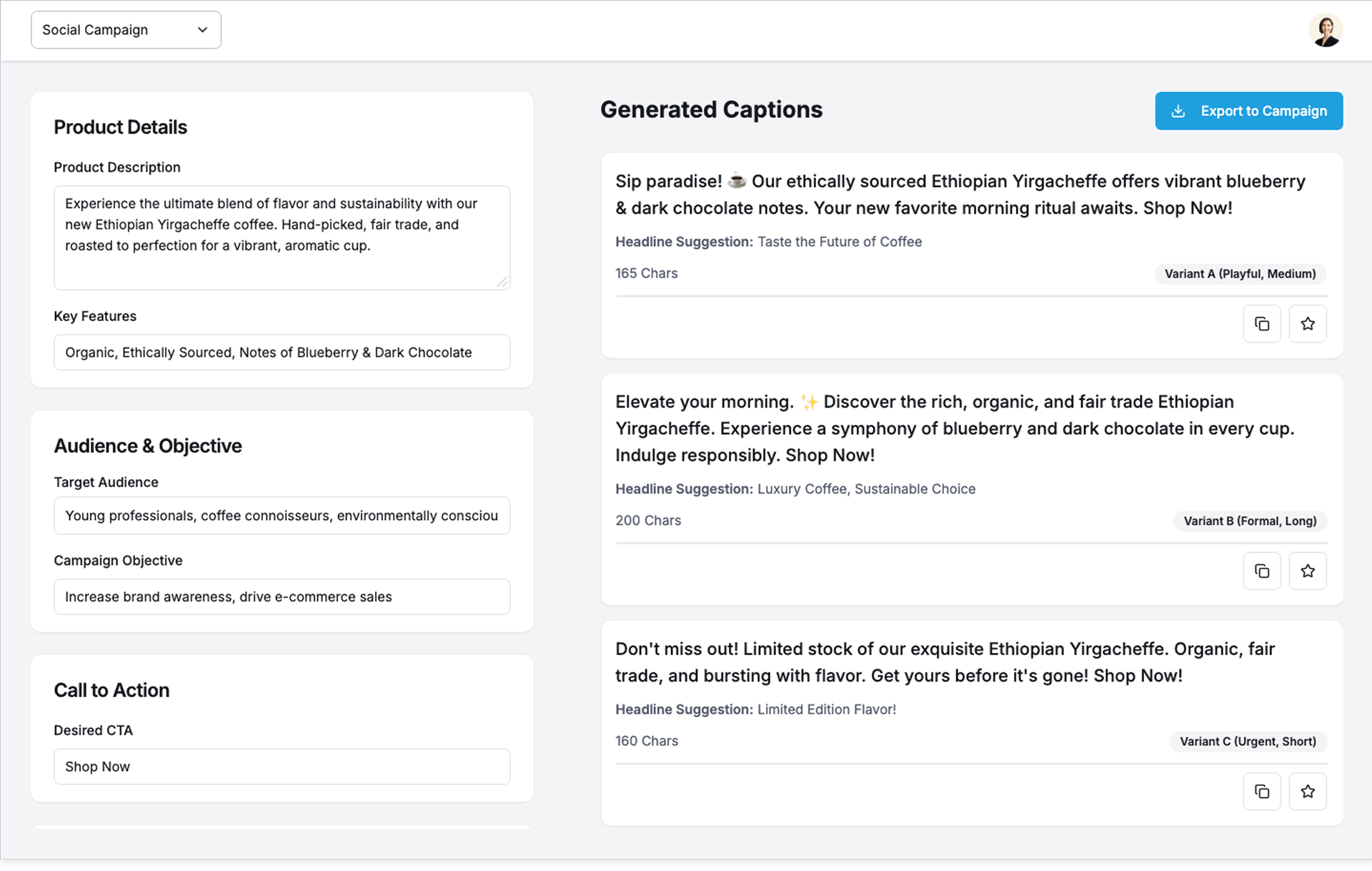 - Refine & Launch – Edit or export captions for your campaigns