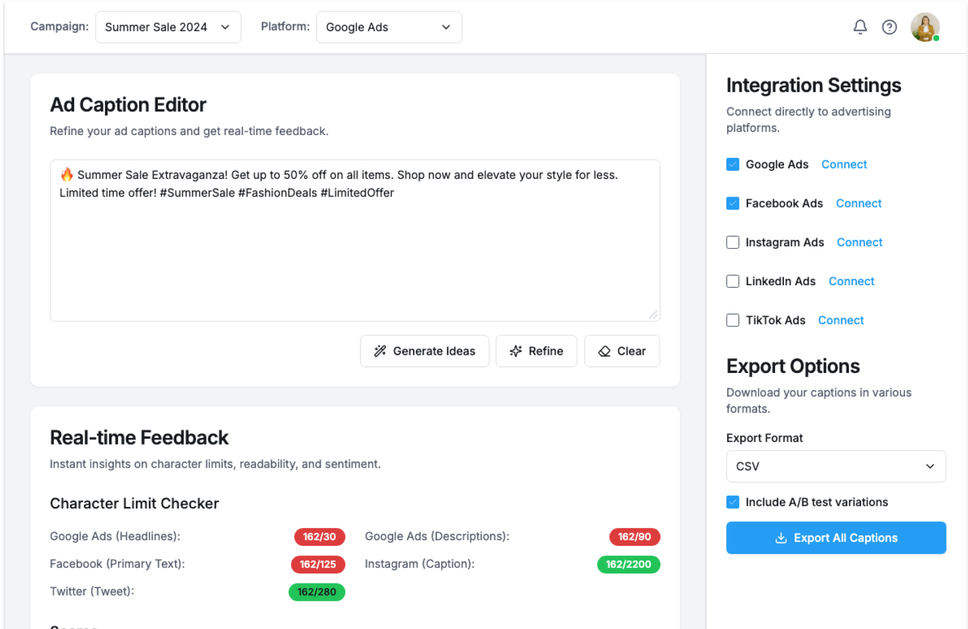 - AI-generated ad captions for multiple platforms