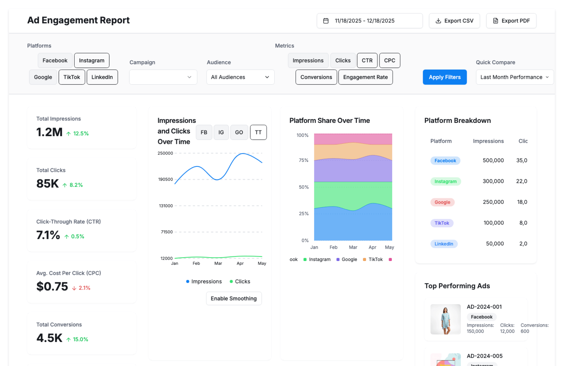 The Ad Engagement Report Generator by Kriatix helps businesses, marketers, and agencies track, analyze, and visualize ad engagement metrics across channels in one centralized dashboard. From clicks and impressions to conversions and audience behavior, this solution transforms raw ad data into easy-to-understand reports that drive smarter campaign decisions.