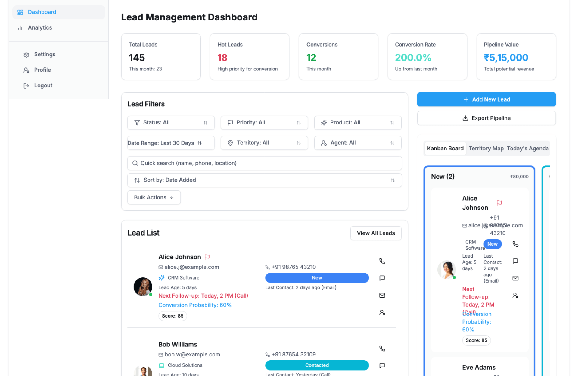 - Filters by agent, region, or lead stage