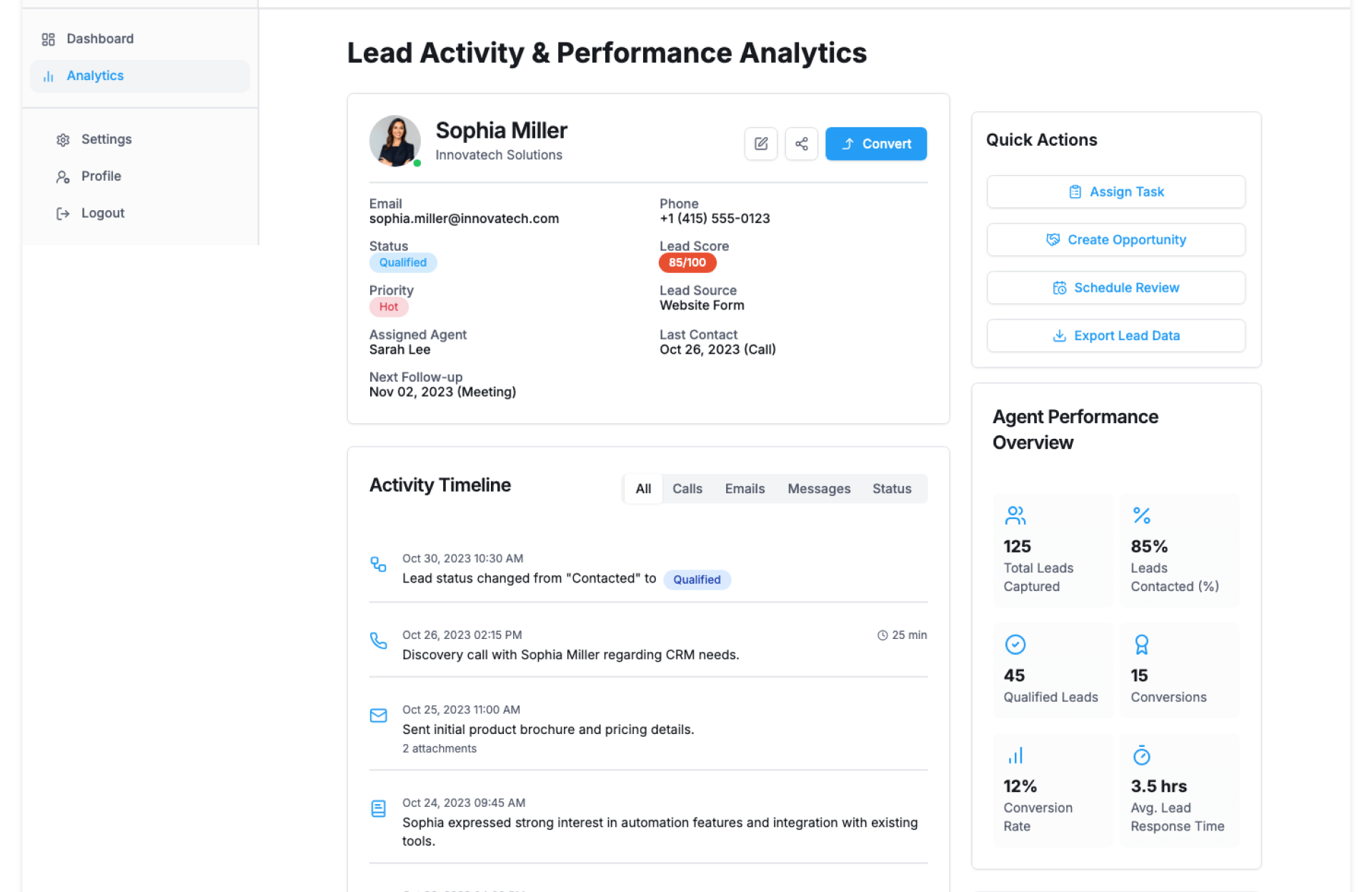 | Sales Managers | Monitor lead progress and agent activity |