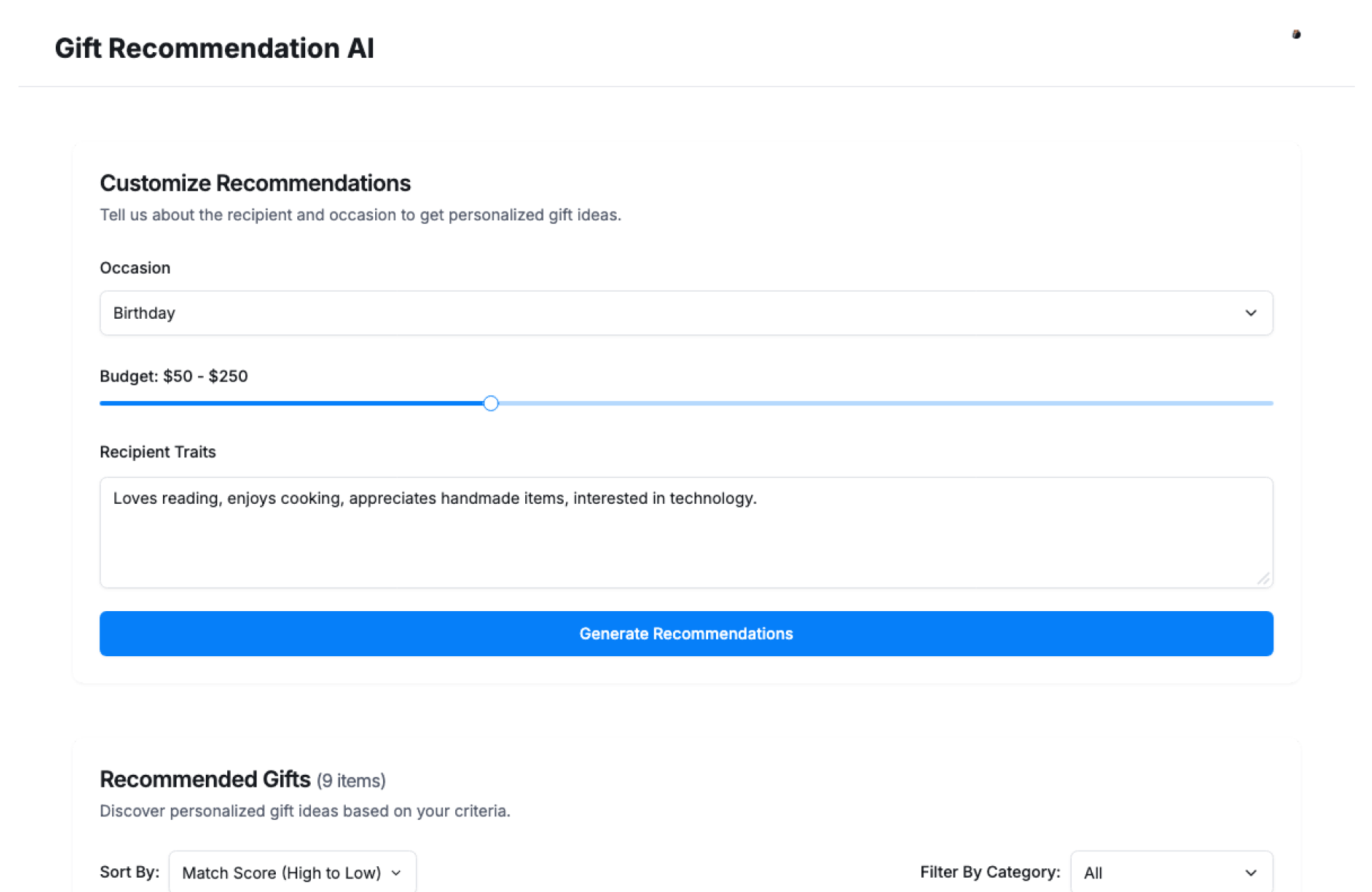 The AI Gift Suggestion Assistant is a ready-to-use conversational and recommendation solution that asks a few simple questions and suggests relevant gift options instantly. It understands intent such as recipient type, interests, age group, and budget to surface curated recommendations.