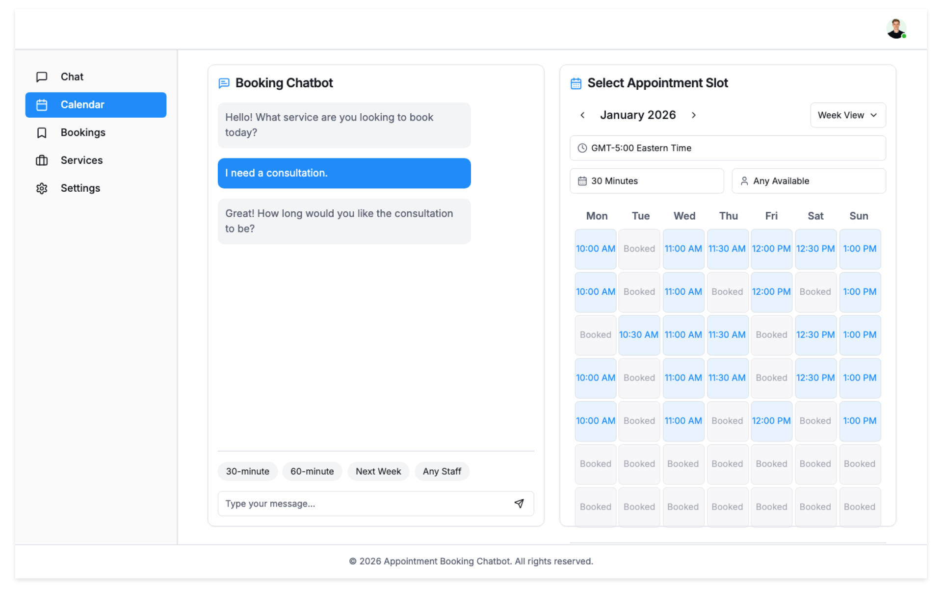 The Appointment Booking Chatbot by Kriatix is an AI-powered conversational assistant that helps businesses automatically schedule, reschedule, and manage appointments across healthcare, salons, consulting, and service-based industries. Available 24/7, it engages customers instantly, reduces manual workload, and ensures your calendar stays full and organized.