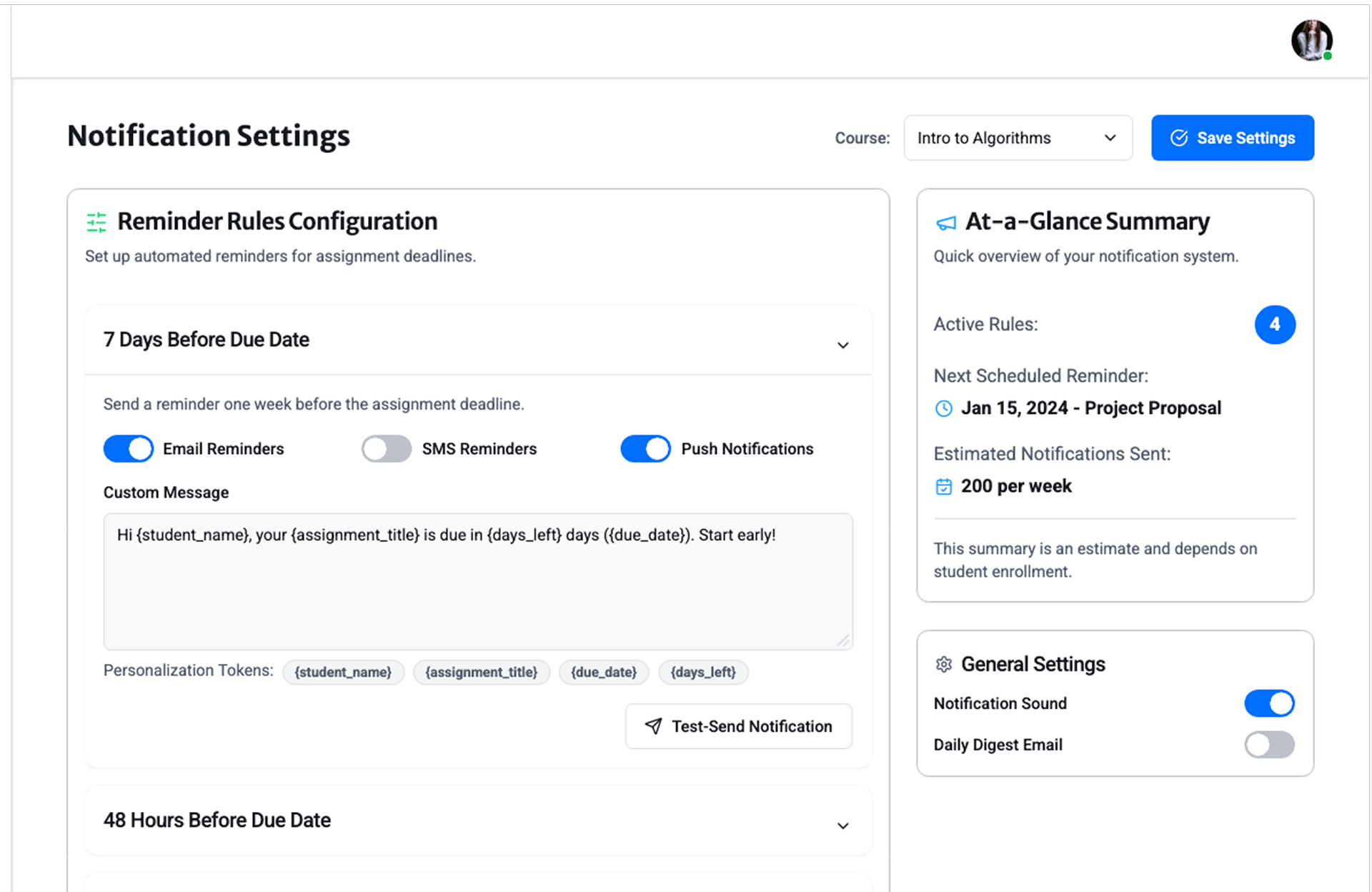 The Assignment Deadline Notifier is a ready-to-use automation that monitors assignment schedules and triggers reminders before due dates. Alerts can be sent at multiple intervals, ensuring learners stay aware and prepared.