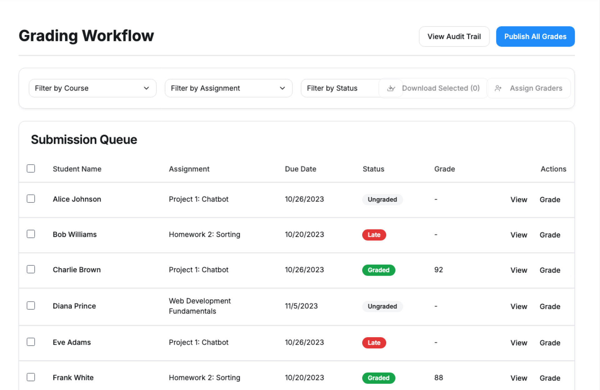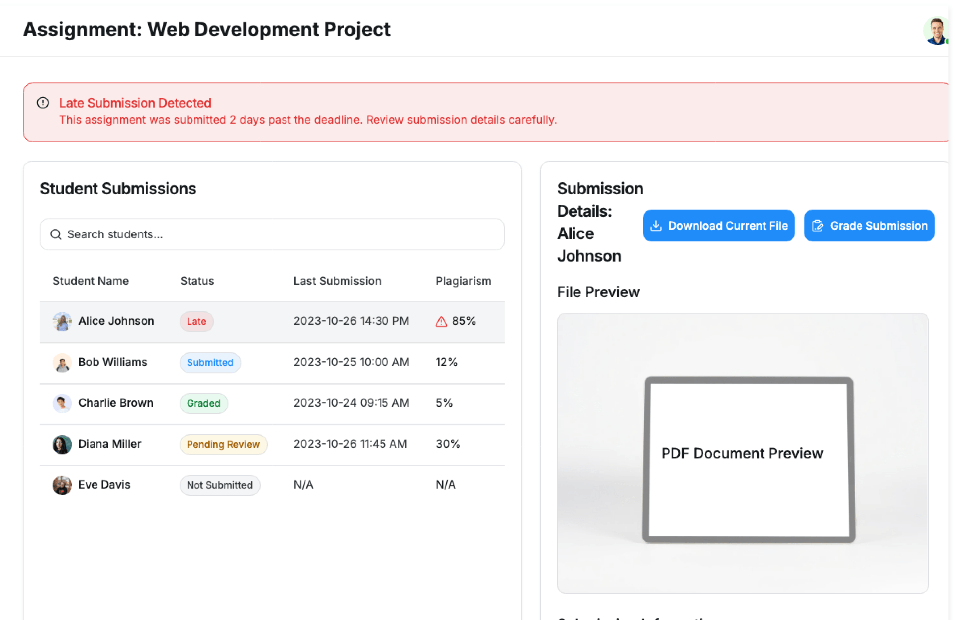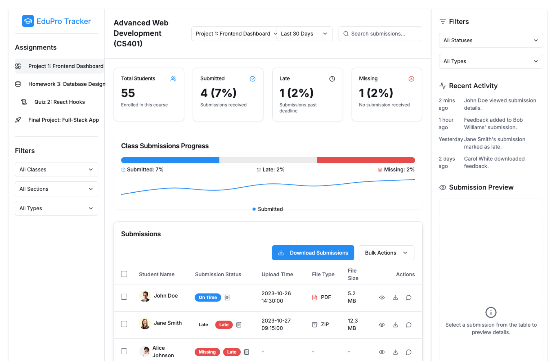 The Assignment Upload Tracker Dashboard is a centralized view that tracks assignment uploads across courses, batches, or cohorts. It consolidates submission status, timestamps, and completion metrics into one dashboard making it easy for instructors and admins to manage academic workflows efficiently.