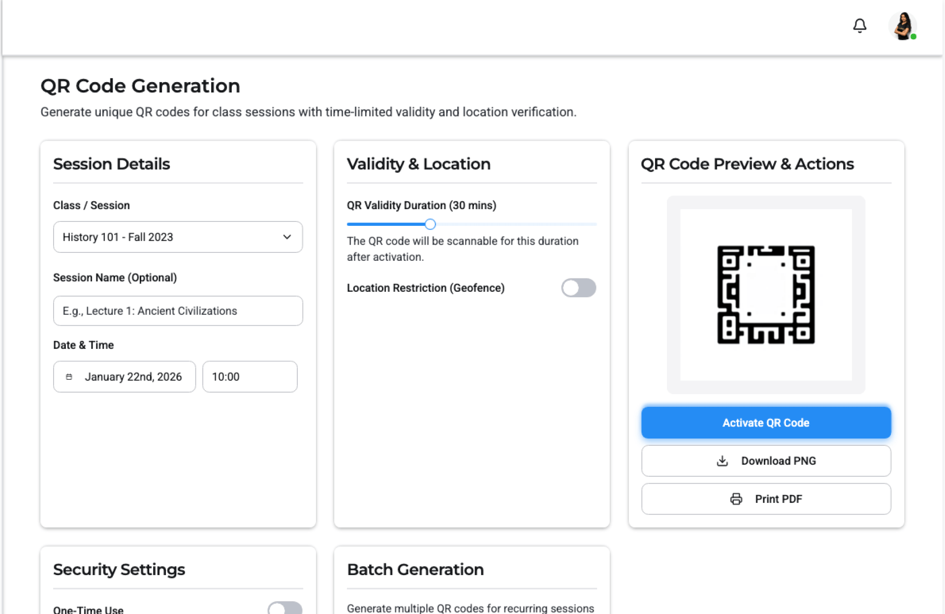 - Generate QR Code – Create a session or class QR code