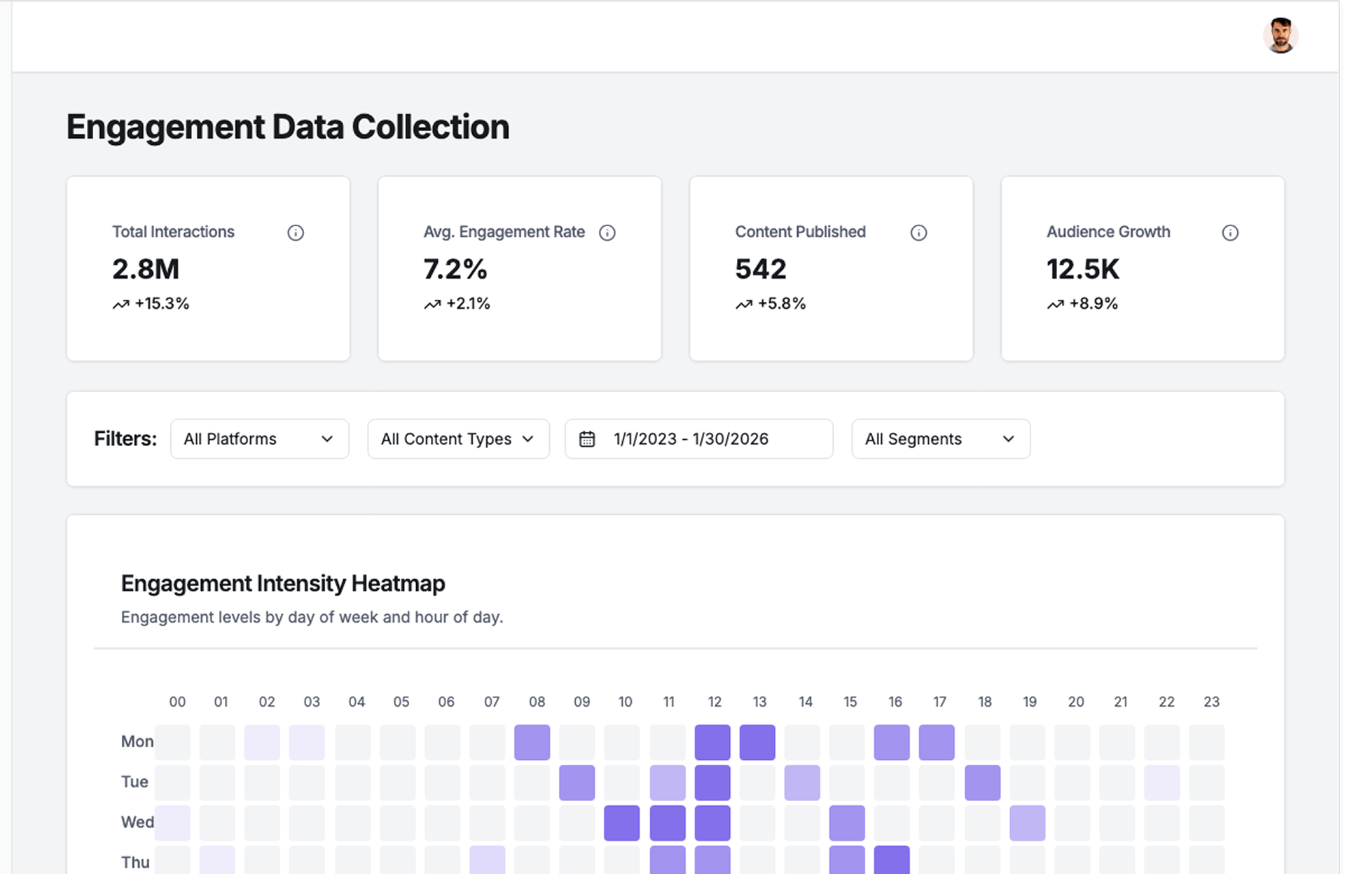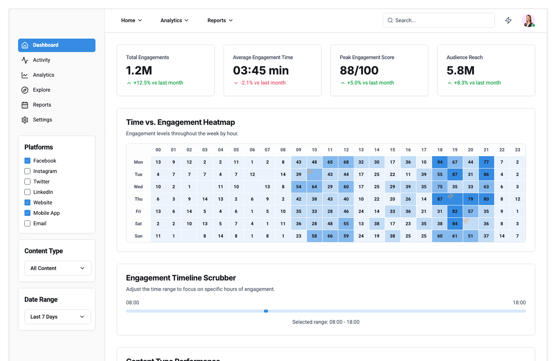 The Audience Engagement Heatmap by Kriatix is an AI-powered visualization tool that shows how audiences interact with your content across platforms. It highlights engagement intensity by time, content type, and channel so teams can focus on what truly captures attention.