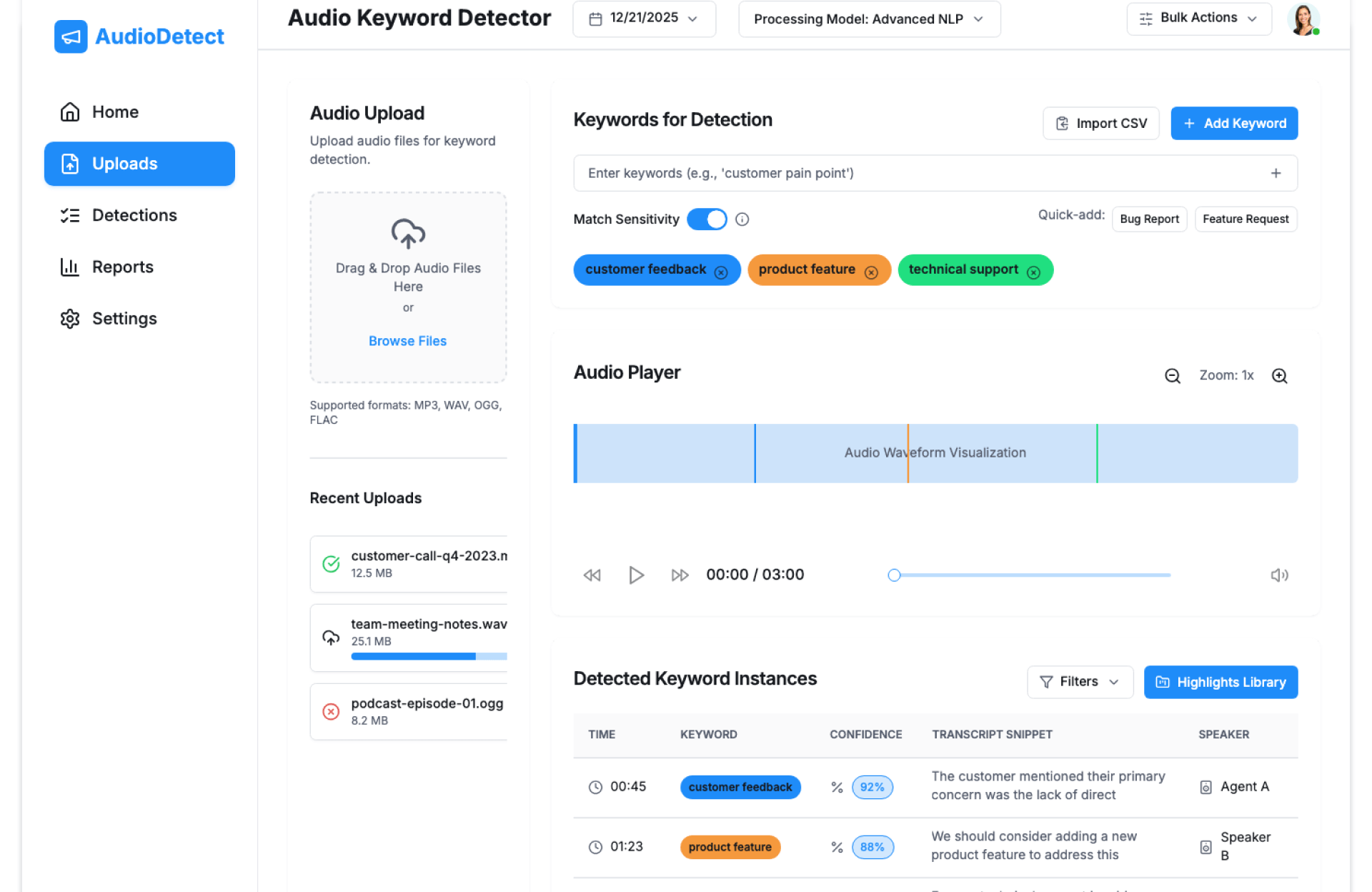 The Audio Keyword Detector is a ready-to-use tool that analyzes audio streams or recordings to identify when specific keywords or phrases are spoken. It timestamps occurrences and presents them in a clear dashboard—making it easy to jump directly to relevant moments.