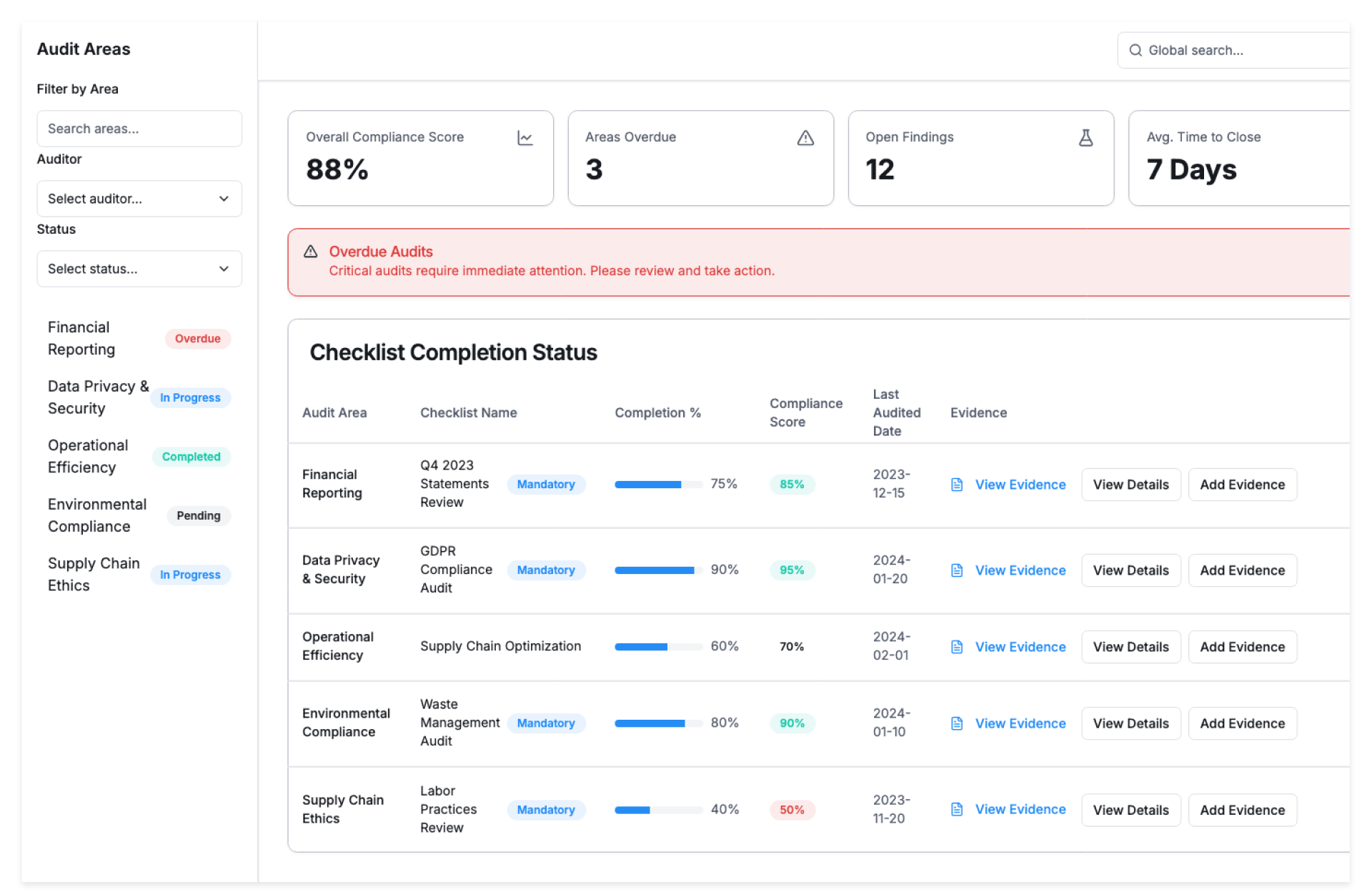 The Audit Checklist Compliance Tracker by Kriatix helps organizations manage audit checklists, track task completion, and maintain compliance readiness. It centralizes audit activities, reduces manual follow-ups, and ensures no critical audit item is missed.