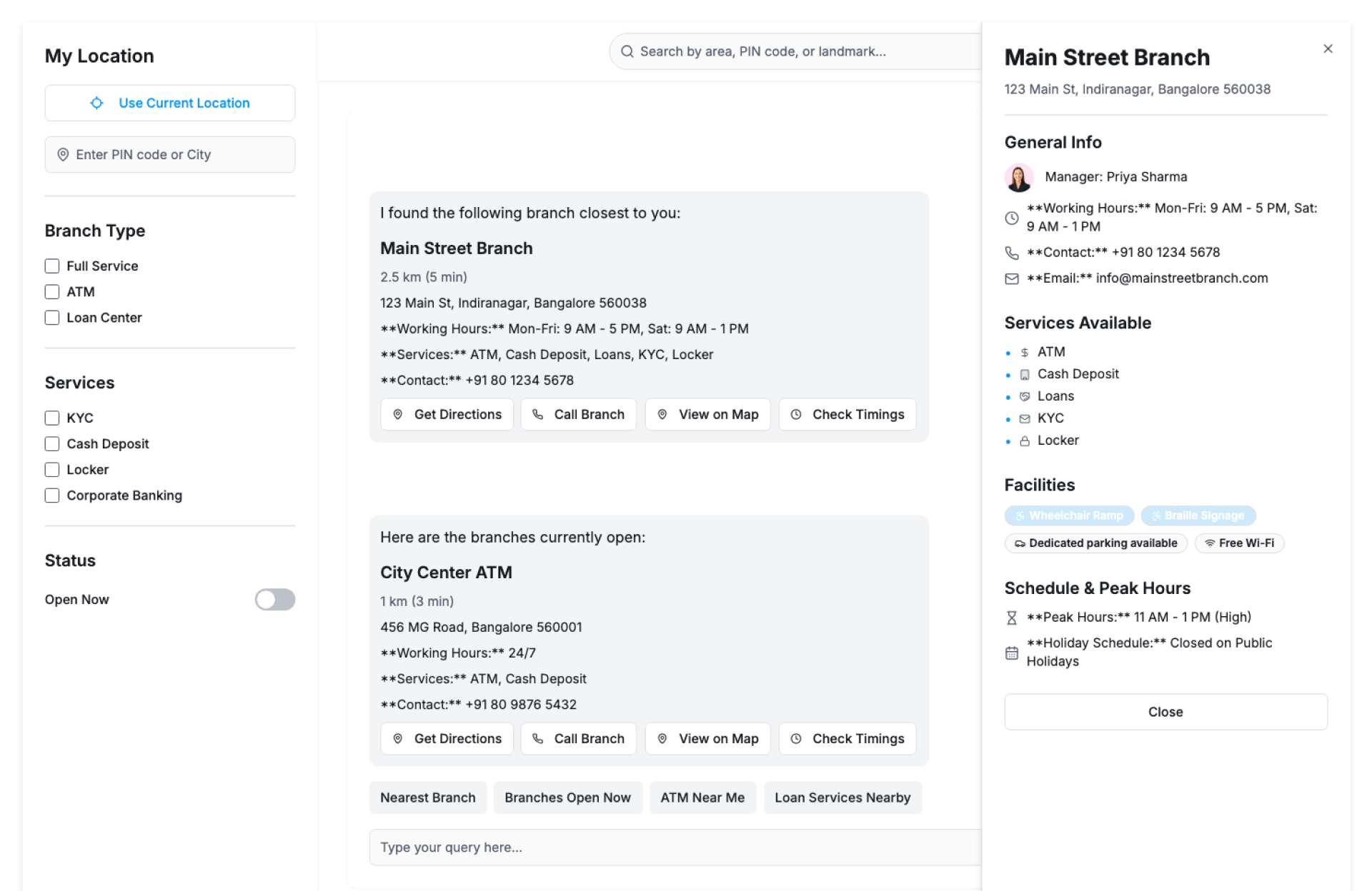 The Branch Finder Assistant is an intelligent location-based assistant that helps users search for branches using simple queries such as city, area, PIN code, or service type. It provides clear details like address, contact info, working hours, and available services.