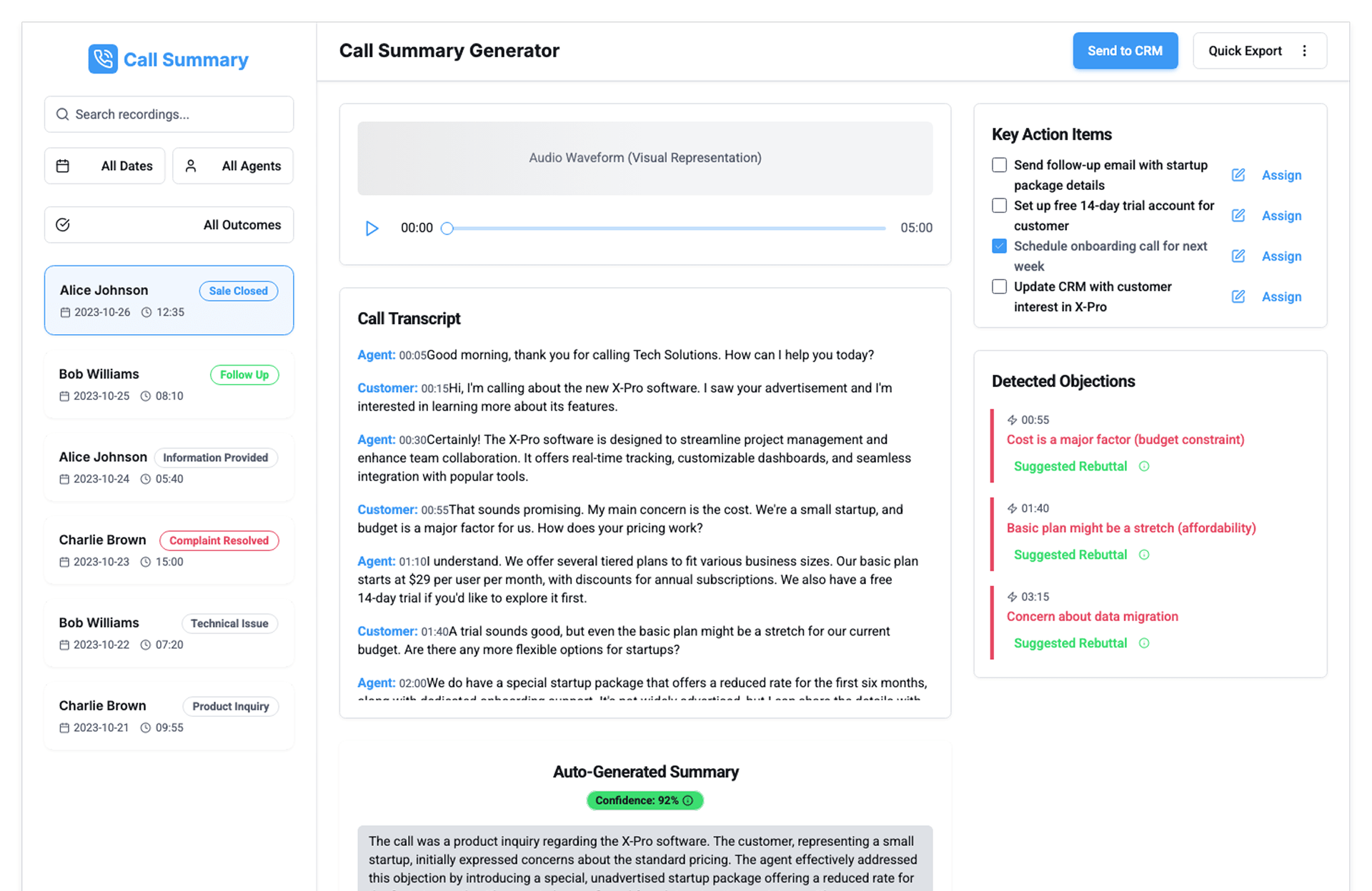| Managers & Leaders | Review call outcomes without listening to full recordings |