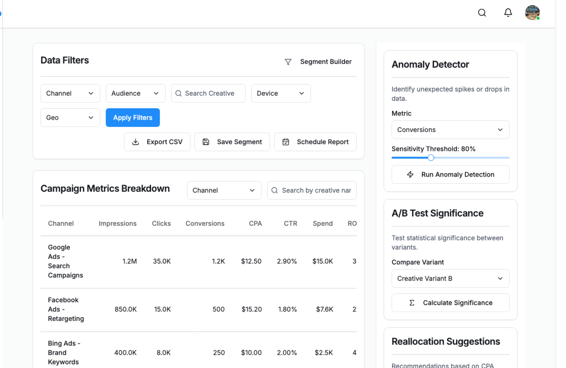 - Campaign-level and channel-level breakdowns