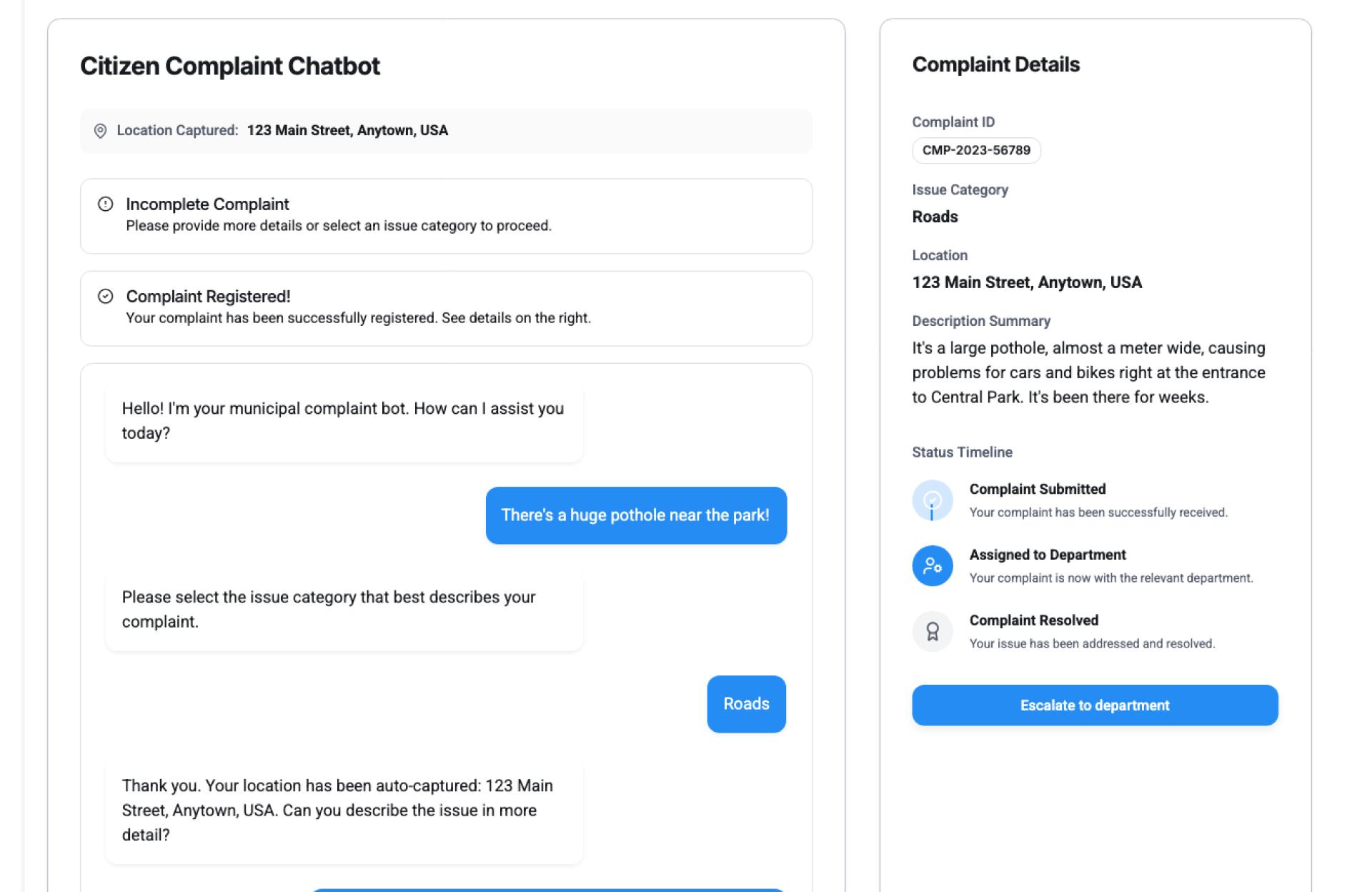 The Citizen Complaint Chatbot is an AI-powered conversational tool that guides citizens through complaint submission. It captures issue details, location, and category, and routes the complaint to the appropriate department for action.