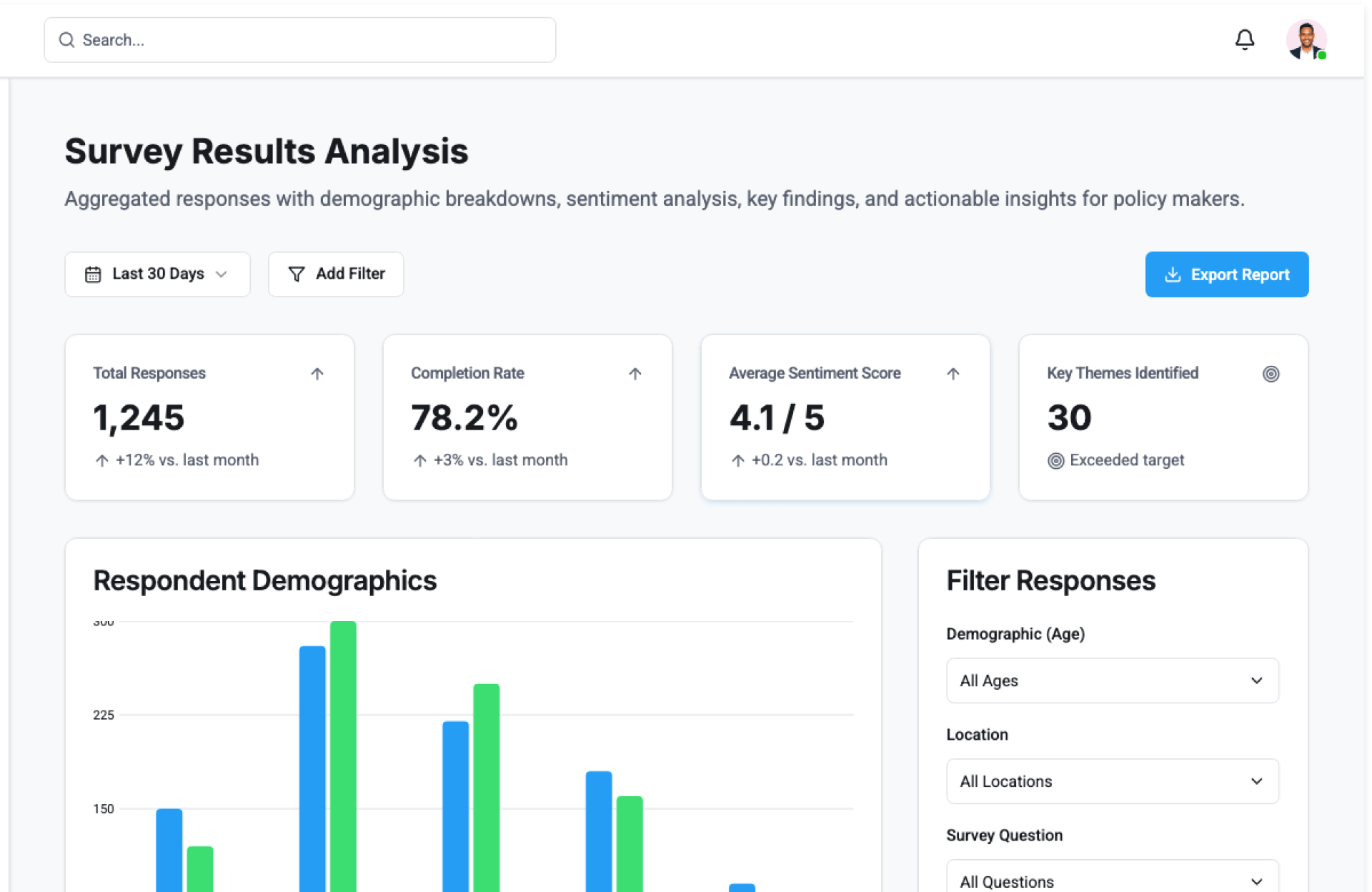 The Citizen Survey Builder by Kriatix is an AI-powered survey creation and analytics solution built for governments, public sector organizations, and civic bodies. It helps you design structured surveys, collect citizen feedback across channels, and turn responses into actionable insights that inform better policy and service decisions.