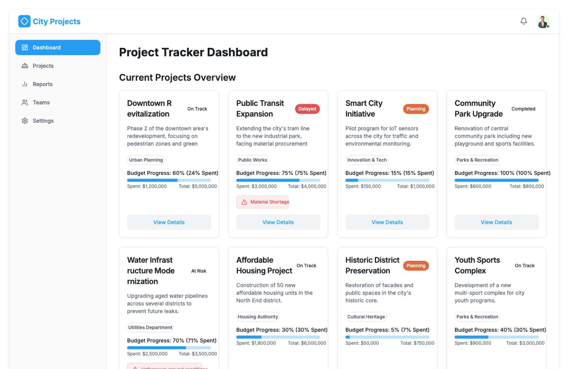 • Centralized city project dashboard