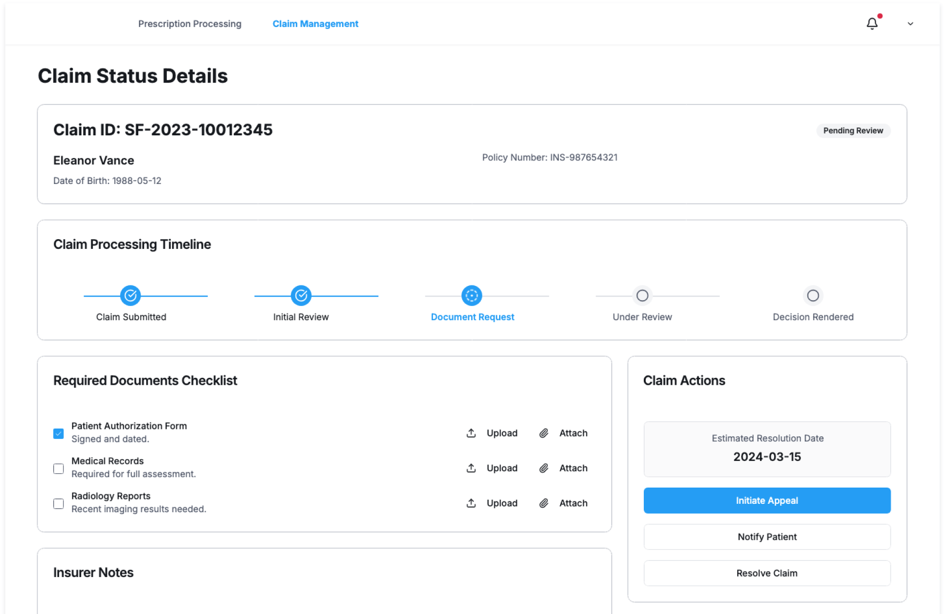 - Status Response – Displays claim stage and next steps