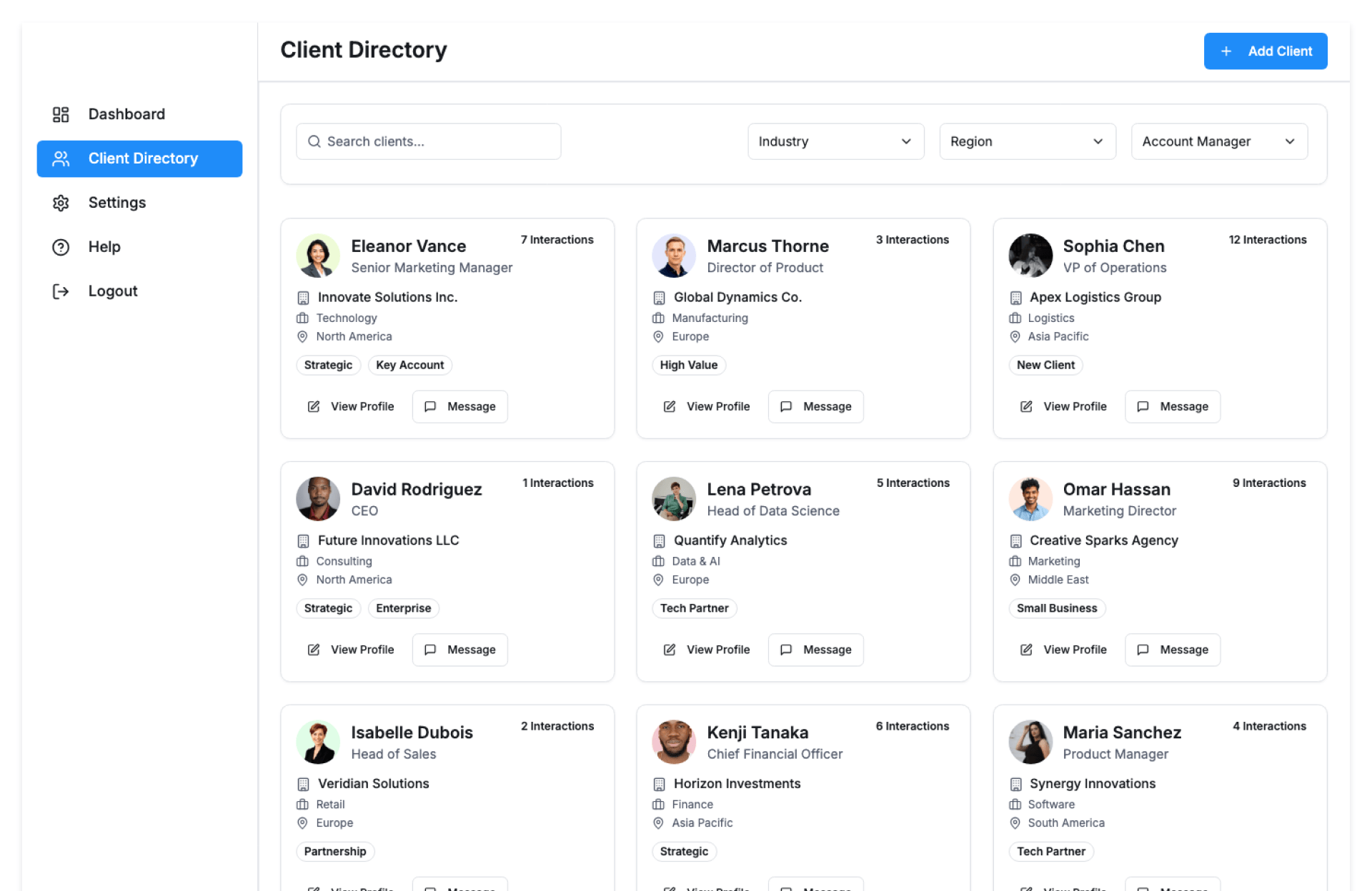 - Centralized client and stakeholder contact directory