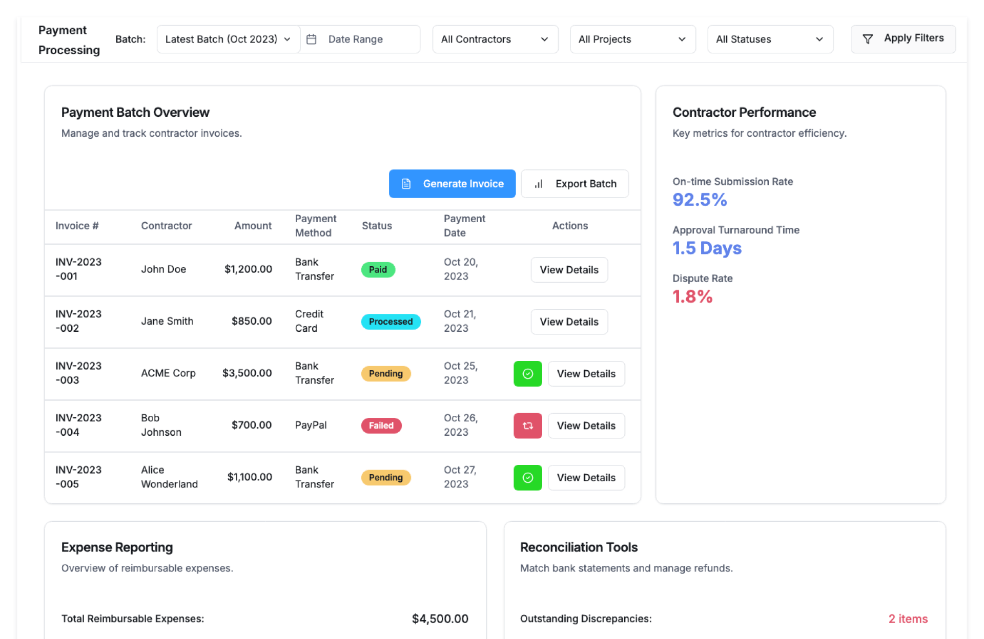 - Set Up Projects & Contractors – Define projects, tasks, and contractor roles
