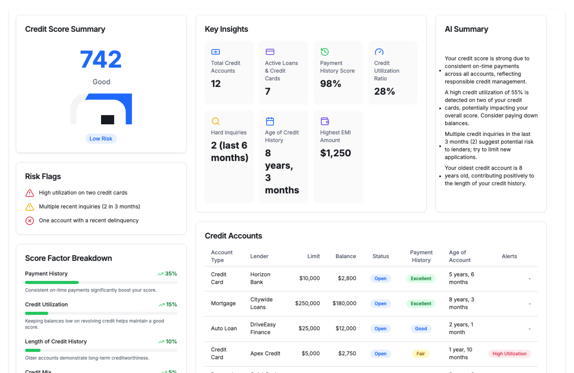 The Credit Report Reader is an intelligent solution that extracts key information from credit bureau reports and presents it in a structured, decision-ready format. It highlights scores, repayment behavior, liabilities, and risk indicators so teams can evaluate profiles faster and more consistently.