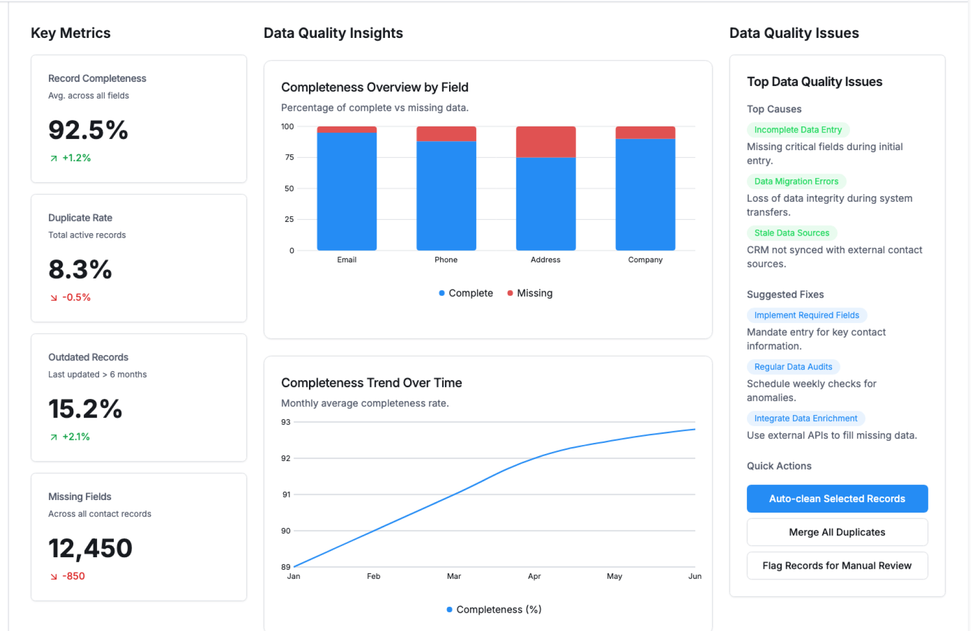 The CRM Health Overview Chart is a visual analytics solution designed to monitor the overall health of your CRM data and sales processes. It consolidates key performance indicators into a single, easy-to-read dashboard, enabling faster decision-making, proactive issue detection, and improved sales outcomes.