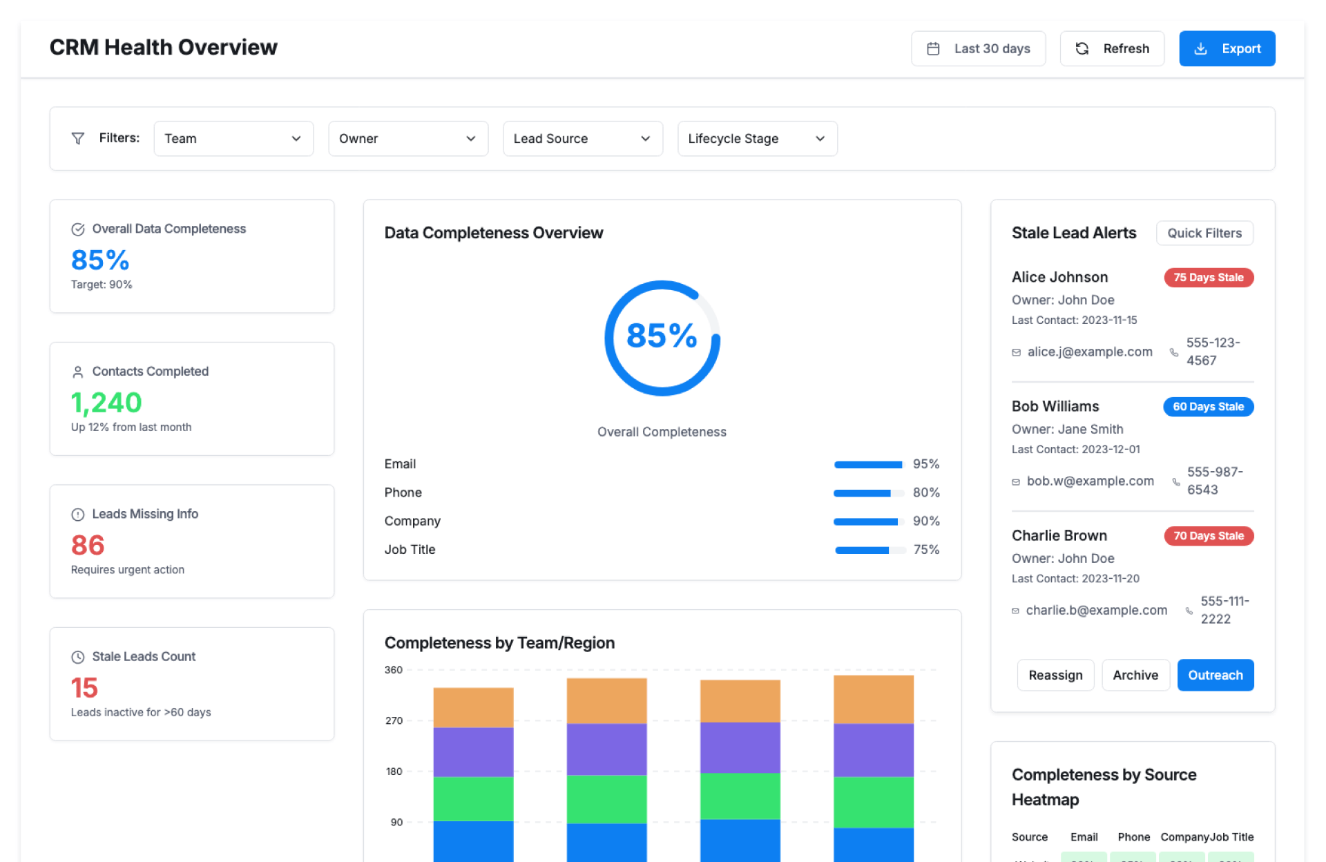 The CRM Health Overview Chart is a visual analytics solution designed to monitor the overall health of your CRM data and sales processes. It consolidates key performance indicators into a single, easy-to-read dashboard, enabling faster decision-making, proactive issue detection, and improved sales outcomes.