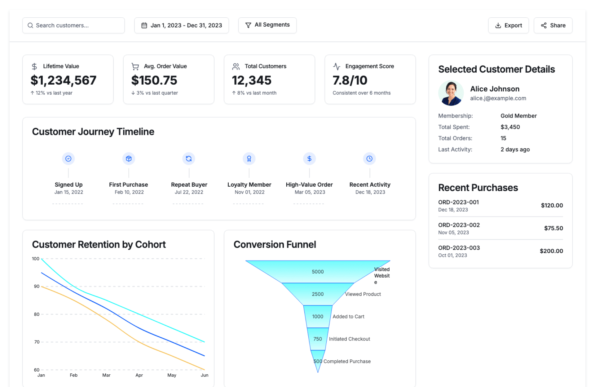 Lifetime spend, order count, recency, returns, and interactions.