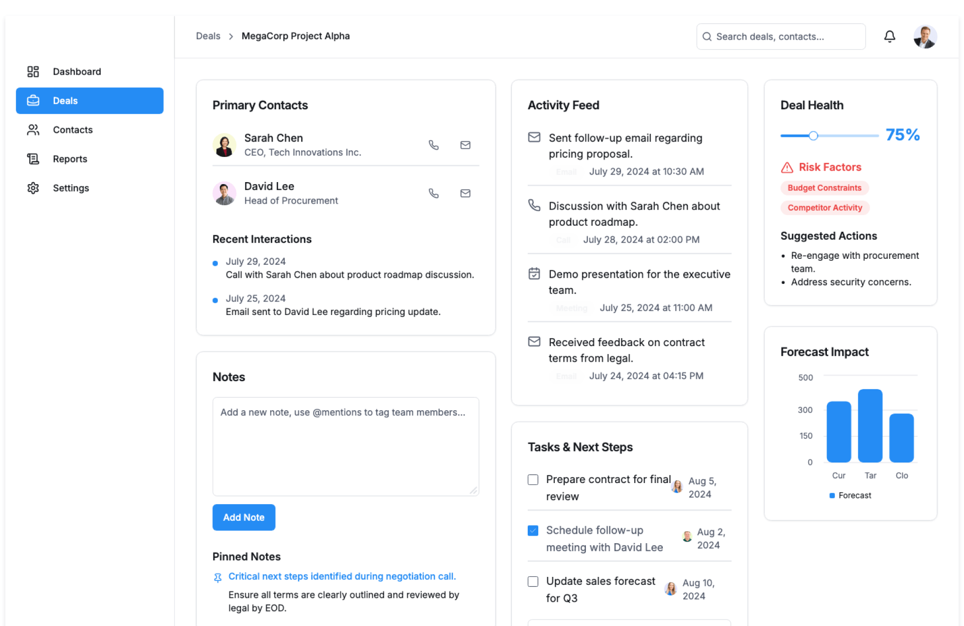 | Sales Managers | Monitor deal health and forecast revenue accurately |
