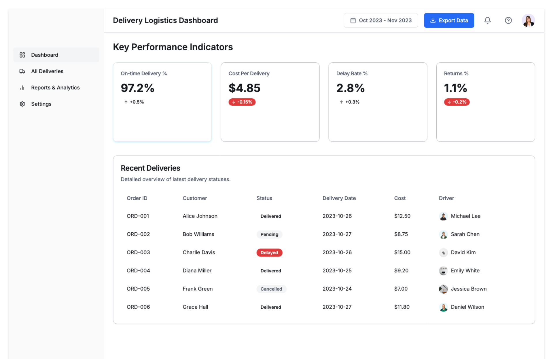 You can track on-time delivery, delays, SLA compliance, route efficiency, driver performance, and order exceptions.