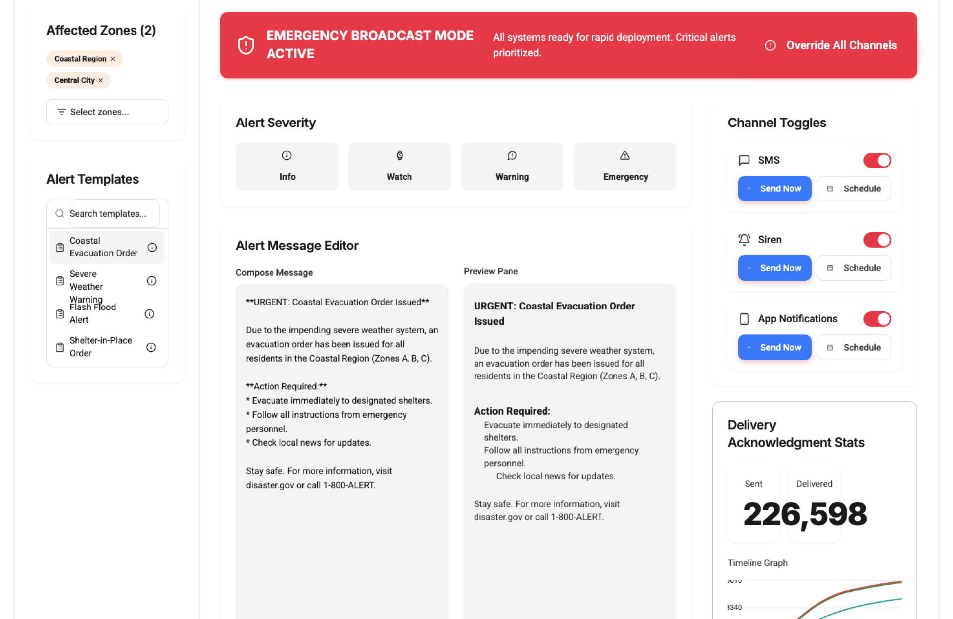 The Disaster Alert Broadcast Tool is an AI-powered communication solution designed to broadcast emergency alerts across multiple channels. It helps agencies notify affected populations with clear, actionable messages based on location, severity, and event type.