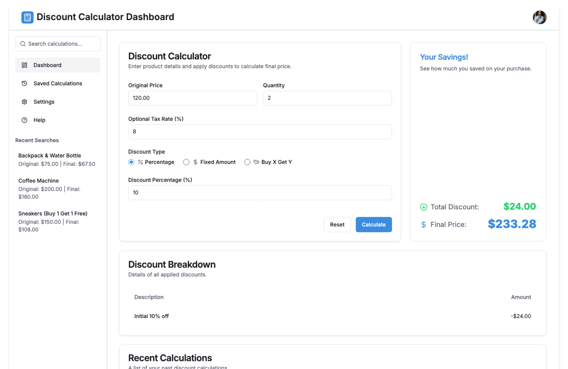 The Discount Calculator by Kriatix helps customers and teams quickly calculate discounts, savings, and final payable amounts. It removes manual math from pricing decisions and brings instant clarity during offers, promotions, and negotiations.