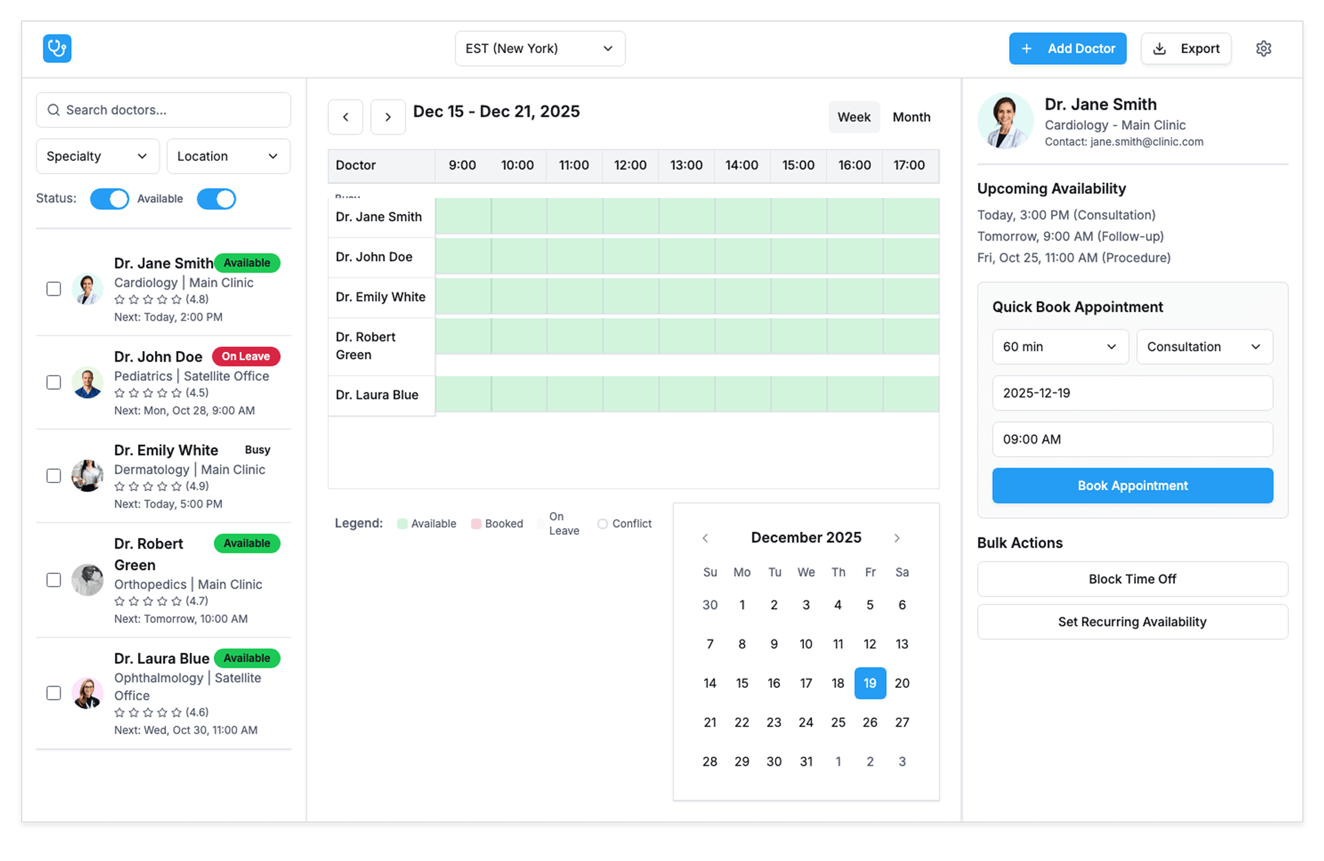 | Front Desk Staff | Instantly check doctor availability for bookings |