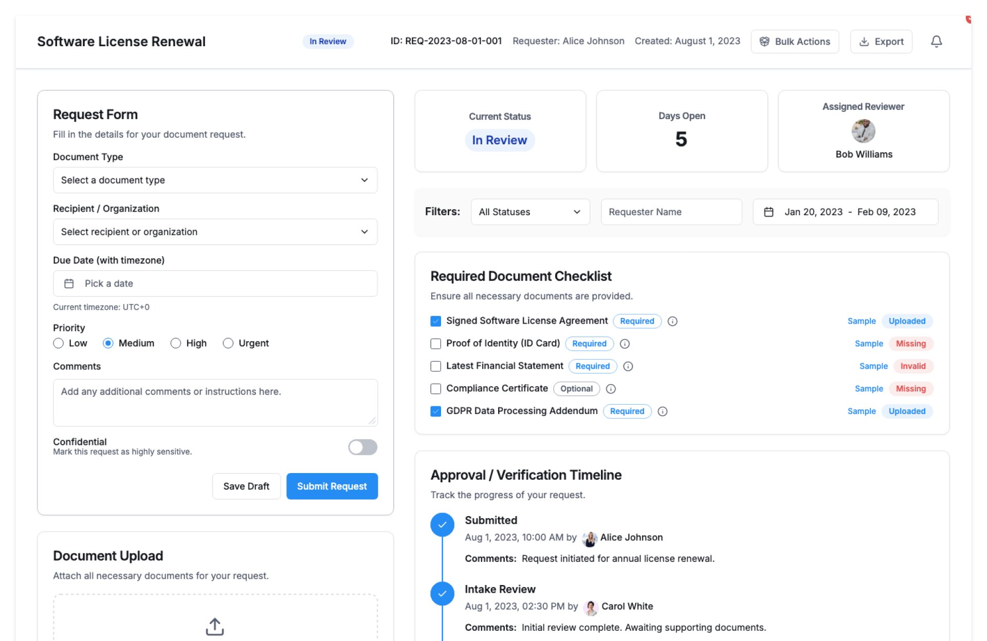 - Centralized document request management