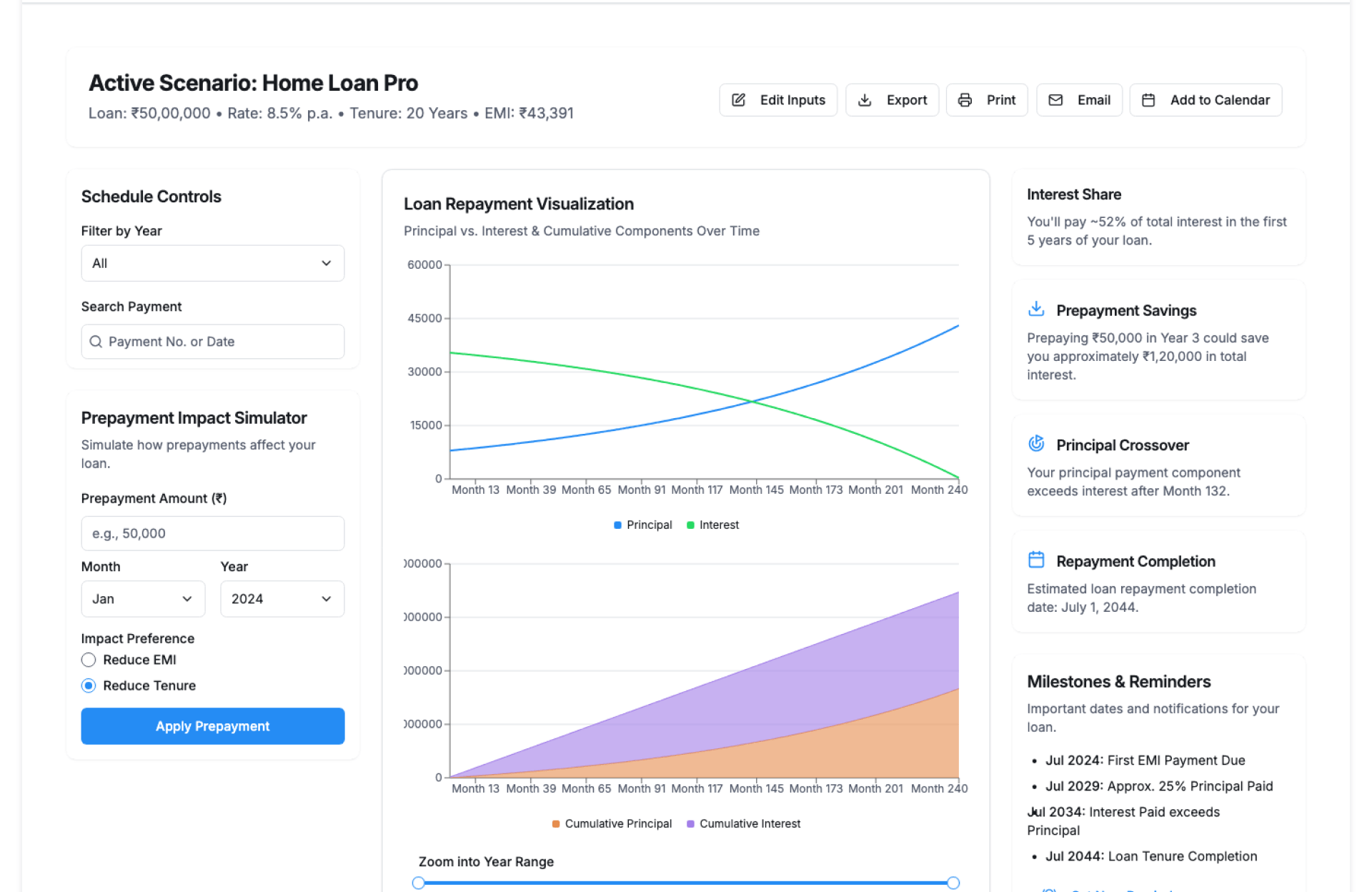 - Monthly EMI, total interest, and total payable view