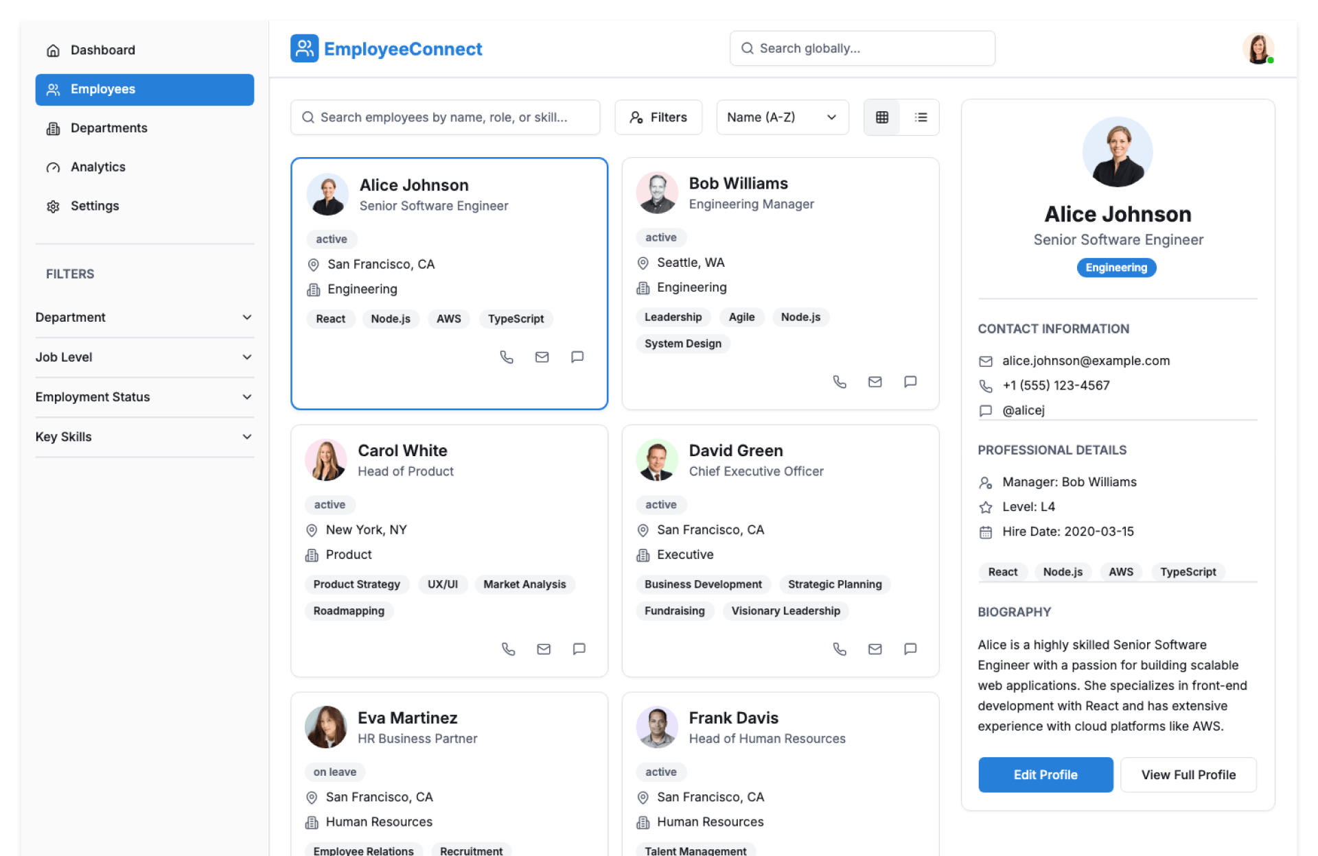 • Smart employee search by name, role, skill, or department