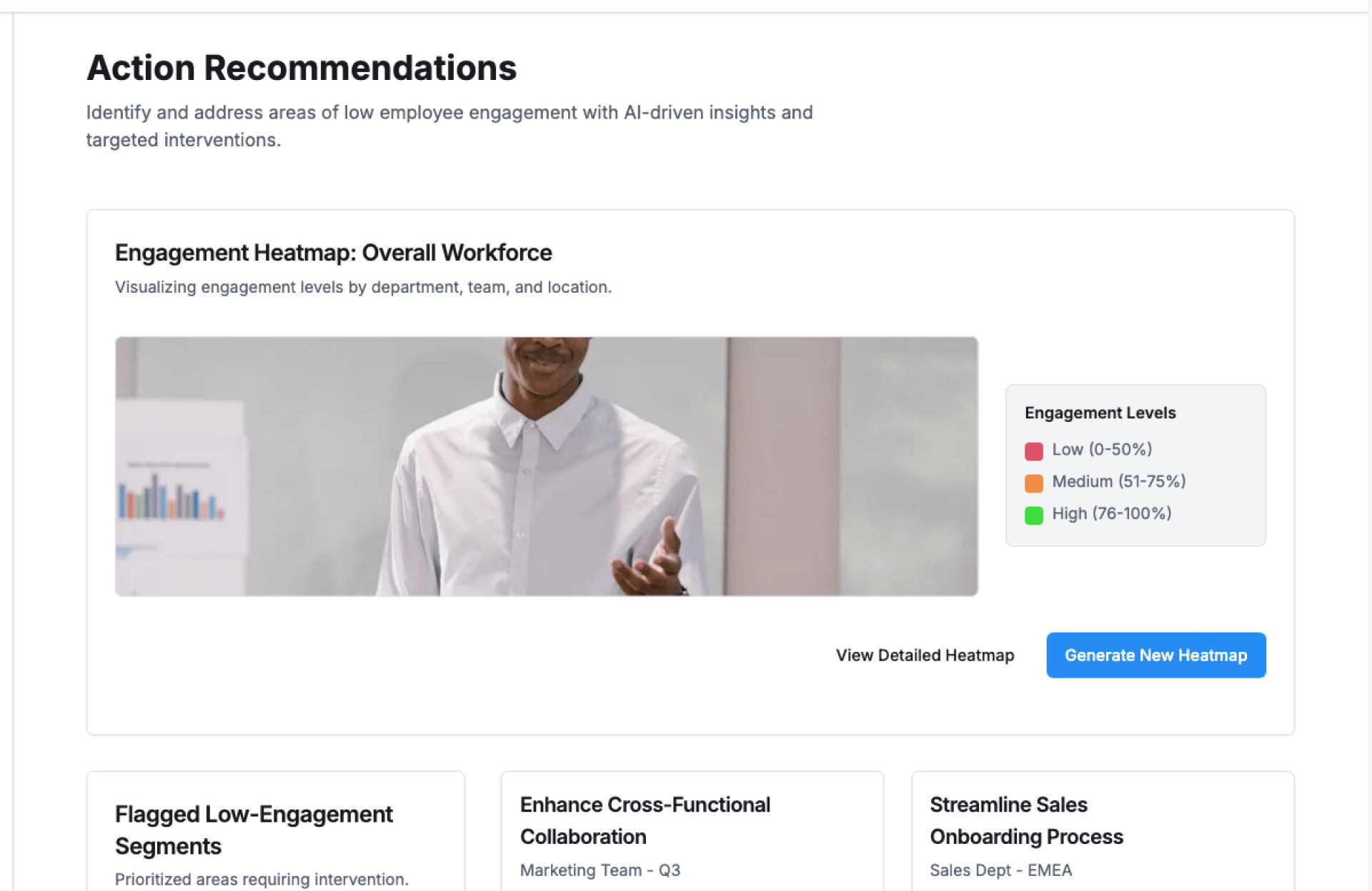 The Employee Engagement Heatmap is a ready-to-deploy solution that visually represents employee sentiment, morale, and engagement levels across your organization. Built on Kriatix’s AI platform, it consolidates feedback, pulse surveys, and engagement indicators into color-coded heatmaps, helping leaders detect patterns, trends, and early warning signs—without complex data analysis.