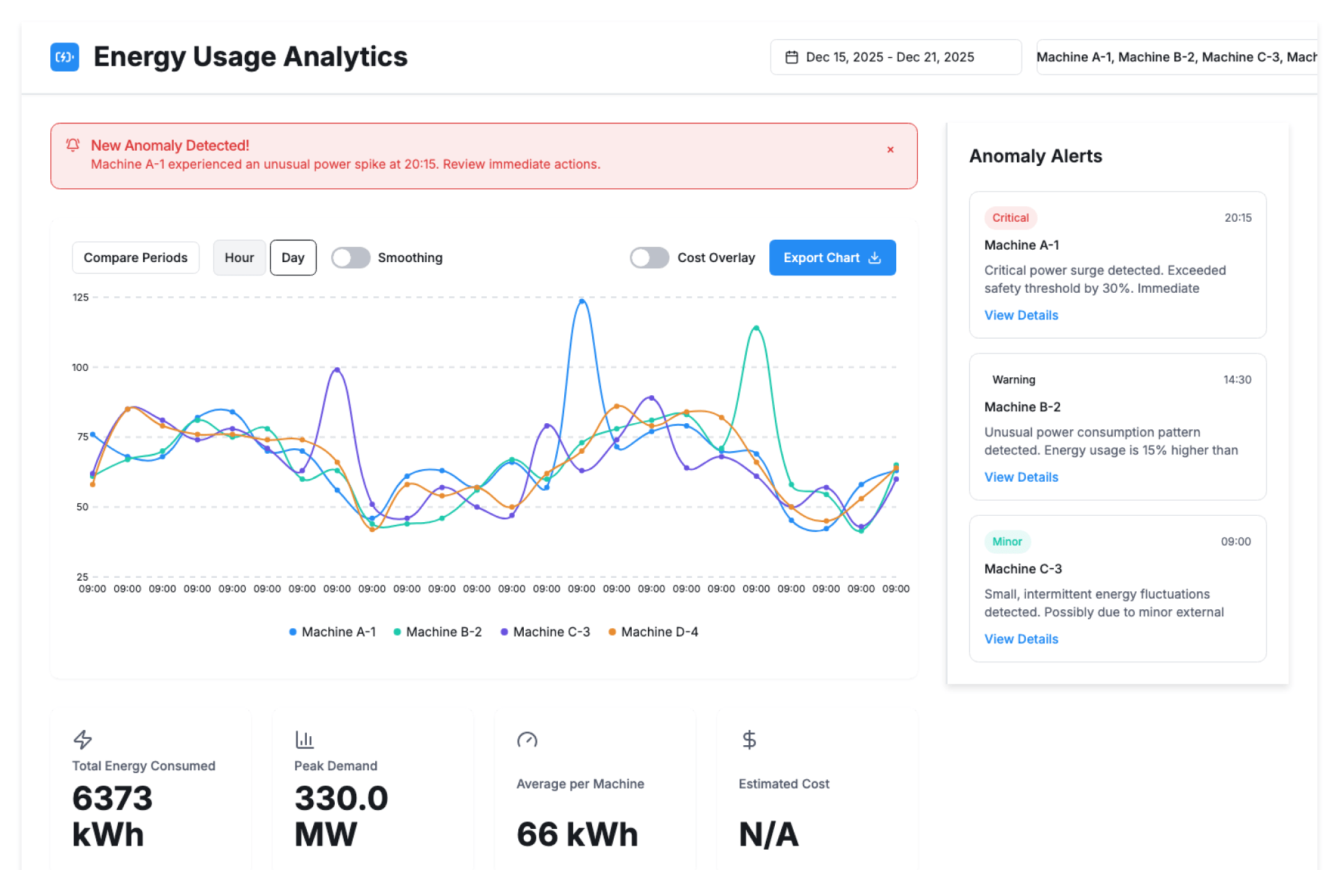 The Energy Usage Chart by Machine is an AI-powered analytics solution that displays energy consumption data for individual machines in an easy-to-understand visual format. It enables teams to monitor trends, compare equipment performance, and detect abnormal energy usage.