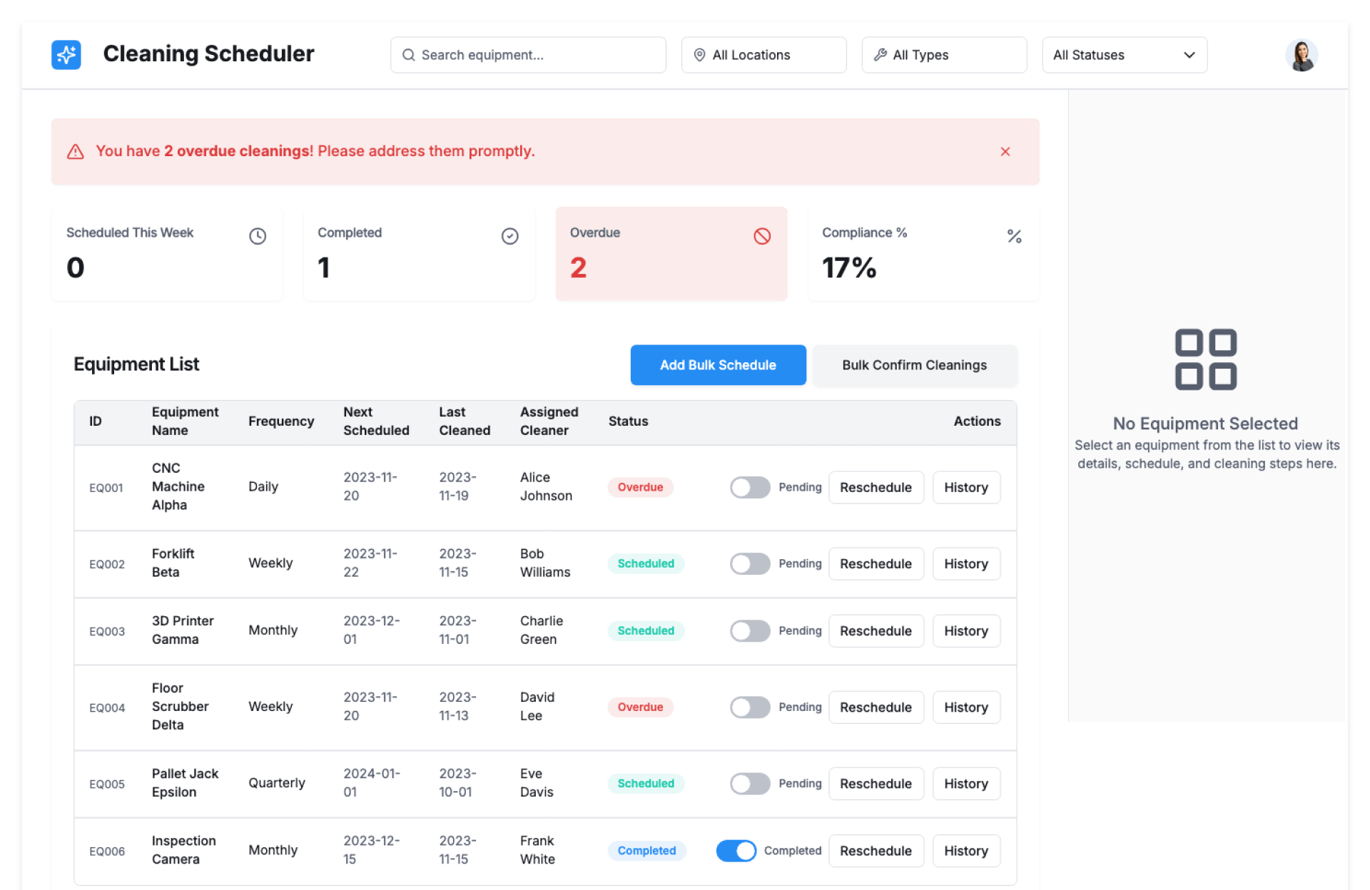 The Equipment Cleaning Scheduler is an AI-powered solution that manages equipment cleaning schedules across machines and locations. It allows teams to define cleaning frequencies, assign responsibilities, and track completion status in a centralized system.