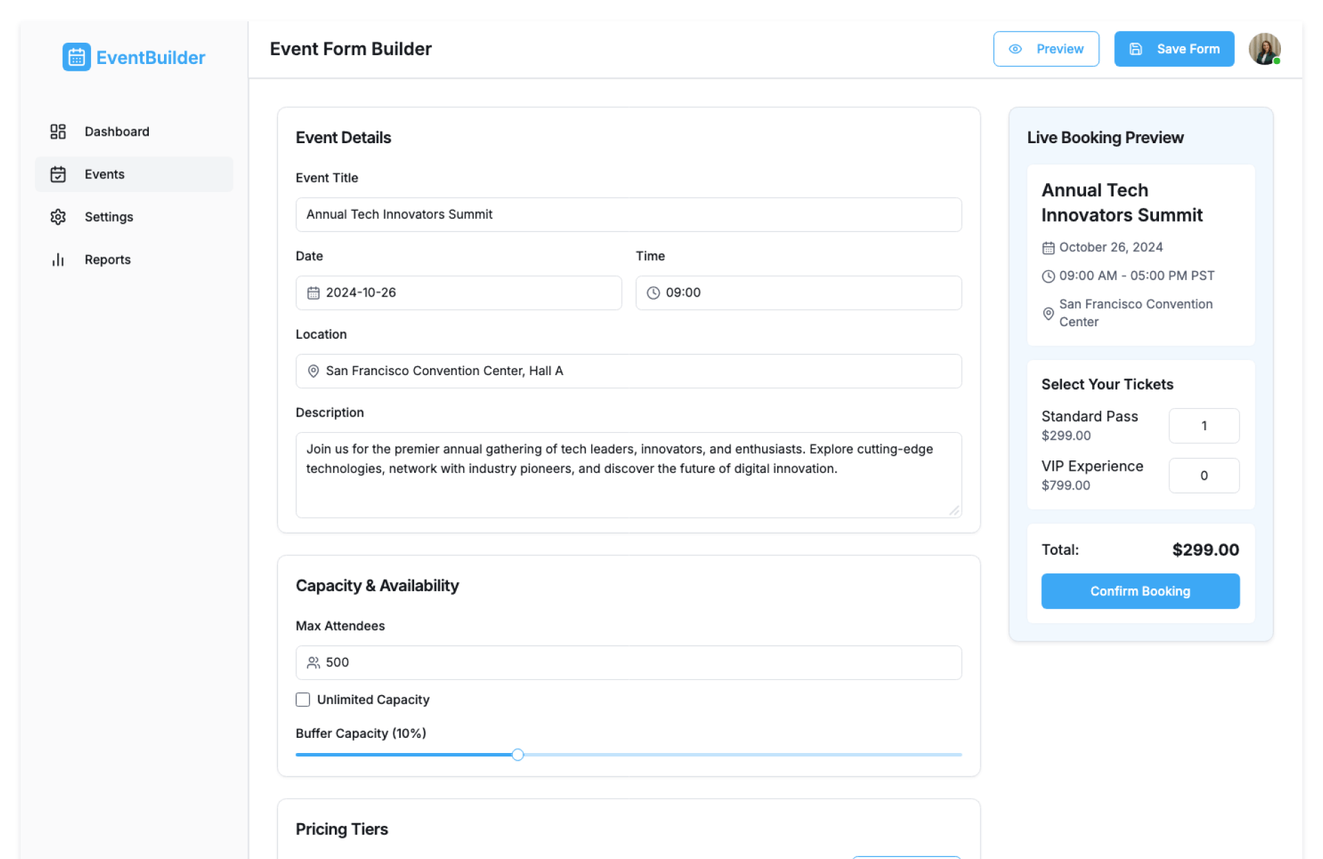The Event Booking Form Generator is an AI-powered form creation solution that enables teams to design, deploy, and manage event booking forms. It captures attendee details, preferences, and requirements while automatically organizing submissions for easy follow-up.